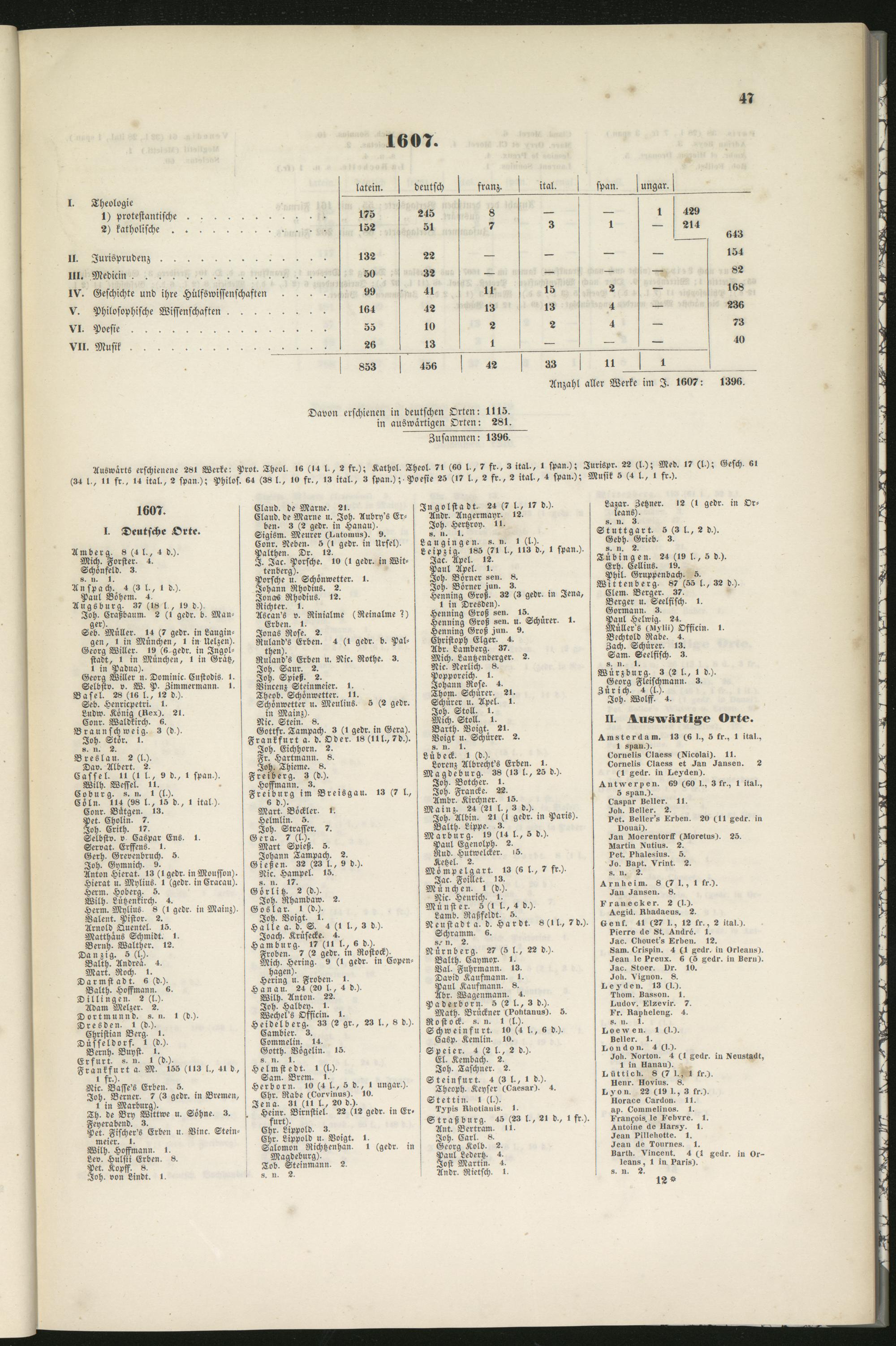 Auswärts erschienene 281 Werke: Prot. Thevl. 16 (14 l., 2 fr.); Kathol, Theol- 71 (KO l-, 7 fr., 3 ital-, I span.); Jurispr. 22 (l.); Med. 17 (l); Gesch. 61(34 t., II fr,, 14 ital., 2 span.); Philos. 64 (38 l., iv fr., 13 ital., 3 span.); Poesie 25 (17 l., 2 fr., 2 ital., 4 span.); Musik s (4 l., i fr.).