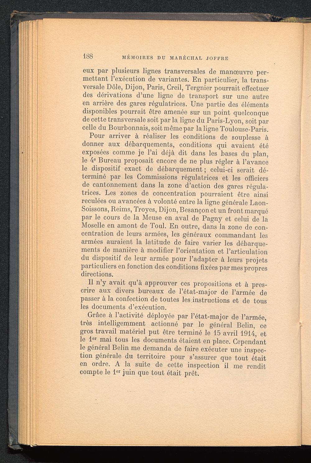 Grâce à l’activité déployée par l’état-major de l’armée,très intelligemment actionné par le général Belin, cegros travail matériel put être terminé le 15 avril 1914, etle 1 er mai tous les documents étaient en place. Cependantle général Belin me demanda de faire exécuter une inspec-tion générale du territoire pour s’assurer que tout étaiten ordre. A la suite de cette inspection il me renditcompte le 1 er juin que tout était prêt.