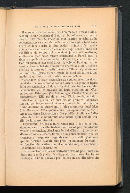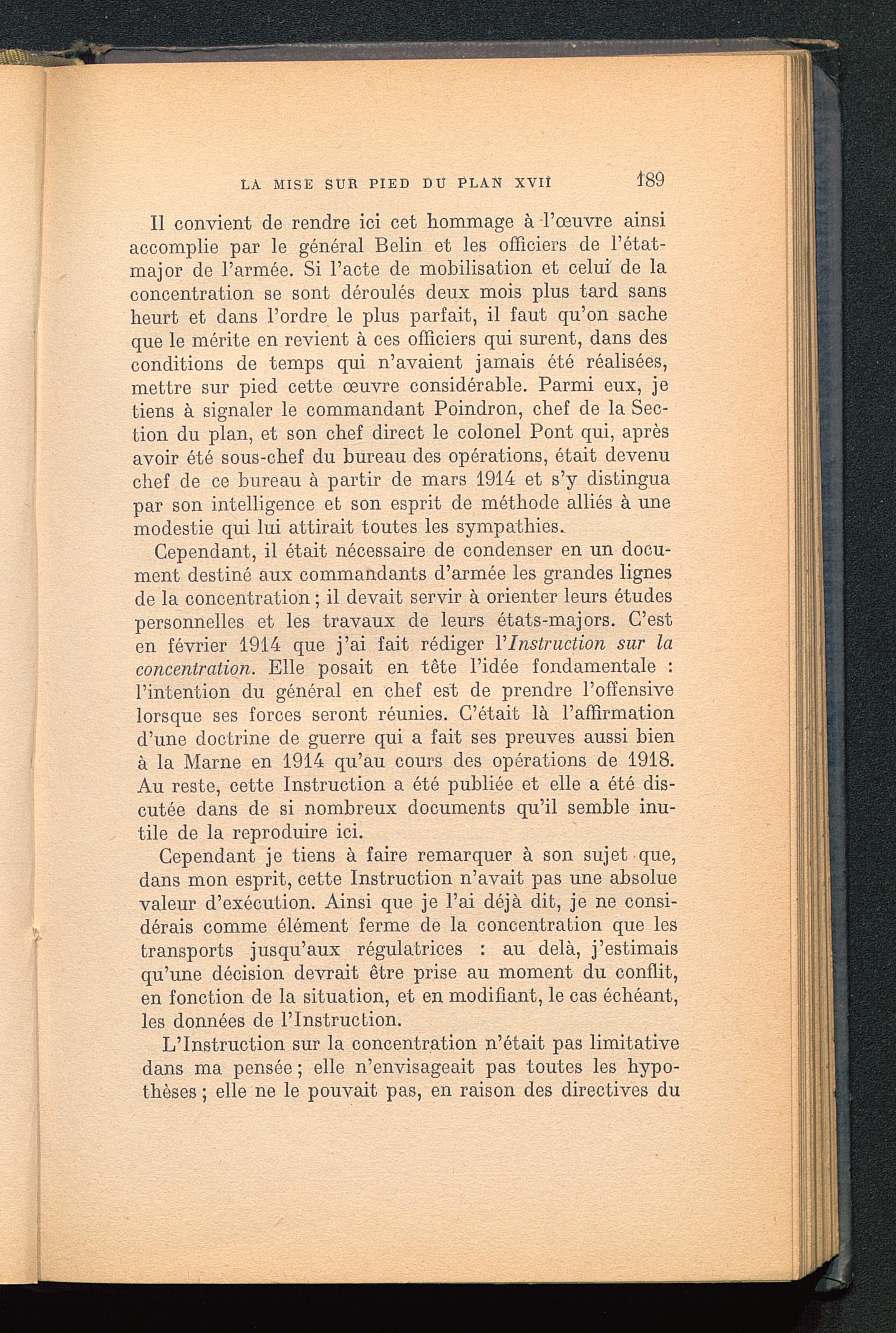 Il convient de rendre ici cet hommage à -l’oeuvre ainsiaccomplie par le général Belin et les officiers de l’état-major de l’armée. Si l’acte de mobilisation et celui de laconcentration se sont déroulés deux mois plus tard sansheurt et dans l’ordre le plus parfait, il faut qu’on sacheque le mérite en revient à ces officiers qui surent, dans desconditions de temps qui n’avaient jamais été réalisées,mettre sur pied cette œuvre considérable. Parmi eux, jetiens à signaler le commandant Poindron, chef de la Sec-tion du plan, et son chef direct le colonel Pont qui, aprèsavoir été sous-chef du bureau des opérations, était devenuchef de ce bureau à partir de mars 1914 et s’y distinguapar son intelligence et son esprit de méthode alliés à unemodestie qui lui attirait toutes les sympathies.