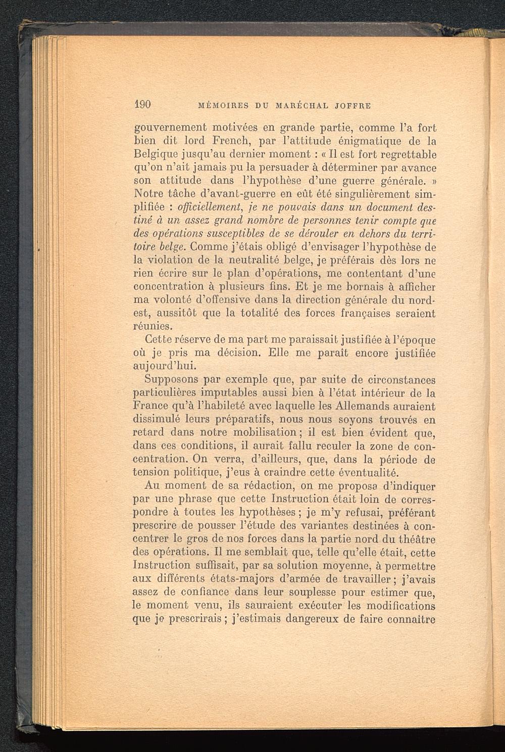 gouvernement motivées en grande partie, comme l’a fortbien dit lord French, par l’attitude énigmatique de laBelgique jusqu’au dernier moment : « Il est fort regrettablequ’on n’ait jamais pu la persuader à déterminer par avanceson attitude dans l’hypothèse d’une guerre générale. »Notre tâche d’avant-guerre en eût été singulièrement sim-plifiée : officiellement, je ne pouvais dans un document des-tiné à un assez grand nombre de personnes tenir compte quedes opérations susceptibles de se dérouler en dehors du terri-toire belge . Comme j’étais obligé d’envisager l’hypothèse dela violation de la neutralité belge, je préférais dès lors nerien écrire sur le plan d’opérations, me contentant d’uneconcentration à plusieurs fins. Et je me bornais à afficherma volonté d’offensive dans la direction générale du nord-est, aussitôt que la totalité des forces françaises seraientréunies.