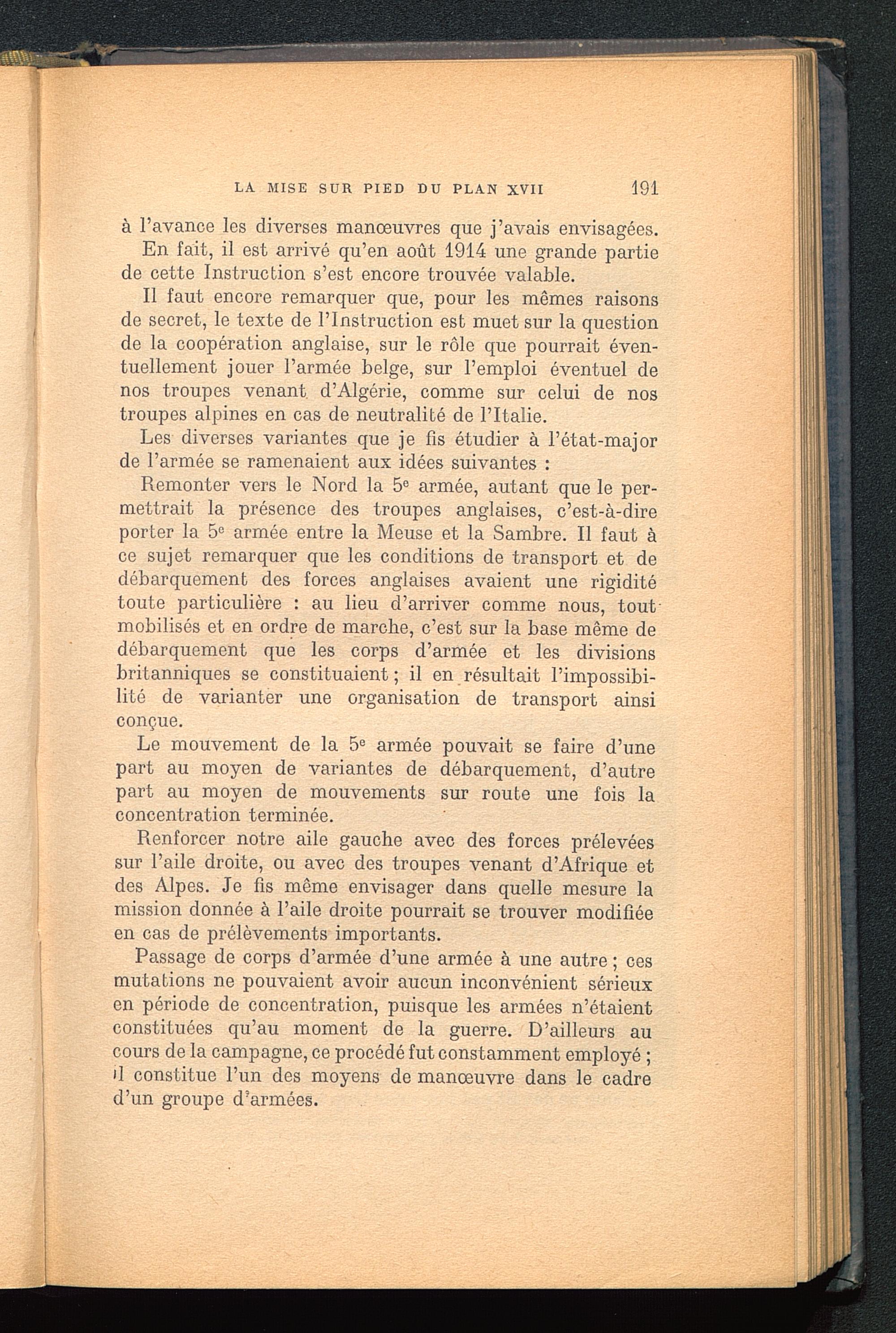 Il faut encore remarquer que, pour les mêmes raisonsde secret, le texte de l’Instruction est muet sur la questionde la coopération anglaise, sur le rôle que pourrait éven-tuellement jouer l’armée belge, sur l’emploi éventuel denos troupes venant d’Algérie , comme sur celui de nostroupes alpines en cas de neutralité de l’Italie .