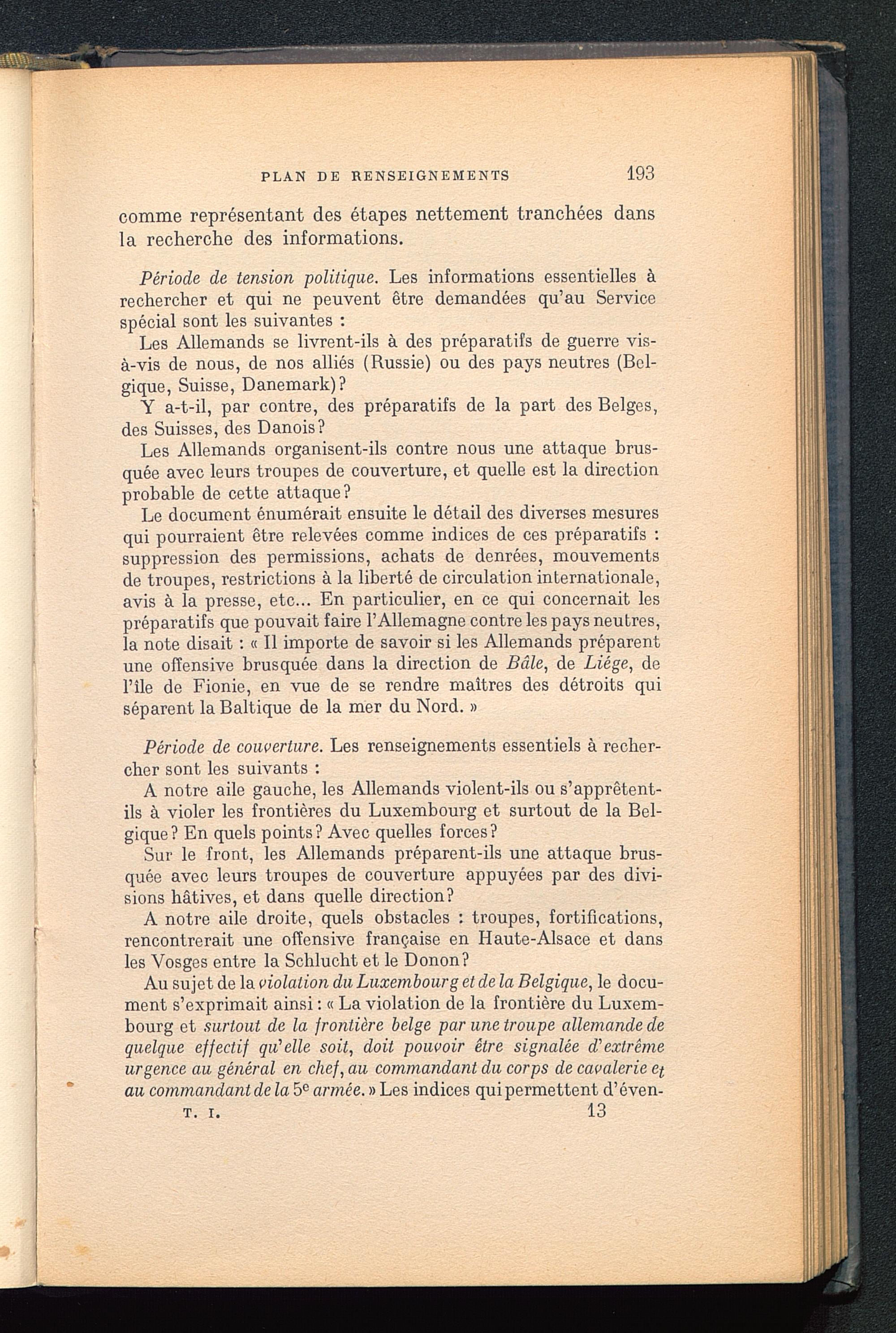 Au sujet de la violation du Luxembourg et de la Belgique, le docu-ment s’exprimait ainsi : « La violation de la frontière du Luxem-bourg et surtout de la frontière belge par une troupe allemande dequelque effectif qu'elle soit, doit pouvoir être signalée d'extrêmeurgence au général en chef, au commandant du corps de cavalerie etau commandant de la 5 e armée. » Les indices qui permettent d’éven-t. i. 13
