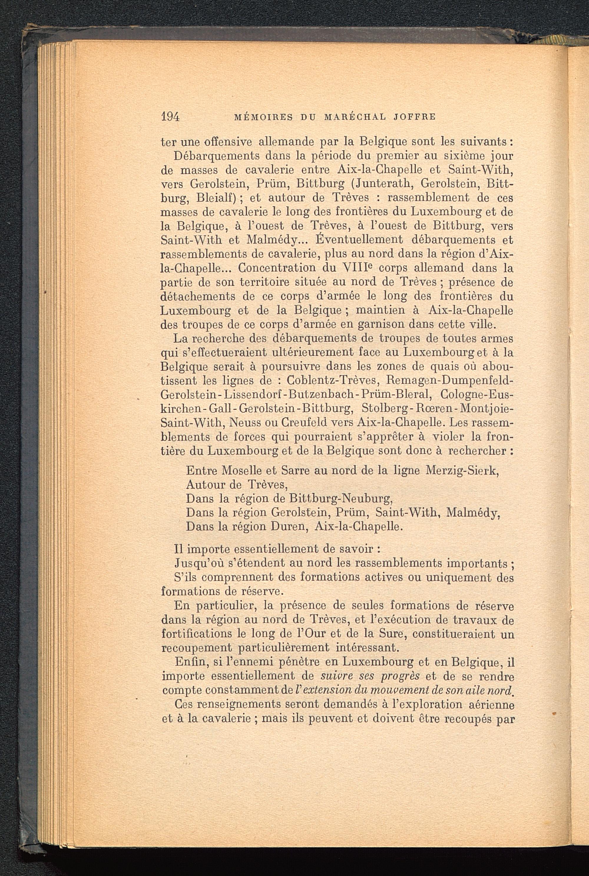 La recherche des débarquements de troupes de toutes armesqui s’effectueraient ultérieurement face au Luxembourg et à laBelgique serait à poursuivre dans les zones de quais où abou-tissent les lignes de : Coblentz-Trèves, Remagen- Dumpenfeld-Gerolstein-Lissendorf-Butzenbach-Prüm- Bleral, Cologne-Eus-kirchen - Gall - Gerolstein - B ittburg, Stolberg - Rœren - Mont j oie-Saint-With, Neuss ou Creufeld vers Aix-la-Chapelle. Les rassem-blements de forces qui pourraient s’apprêter à violer la fron-tière du Luxembourg et de la Belgique sont donc à rechercher :