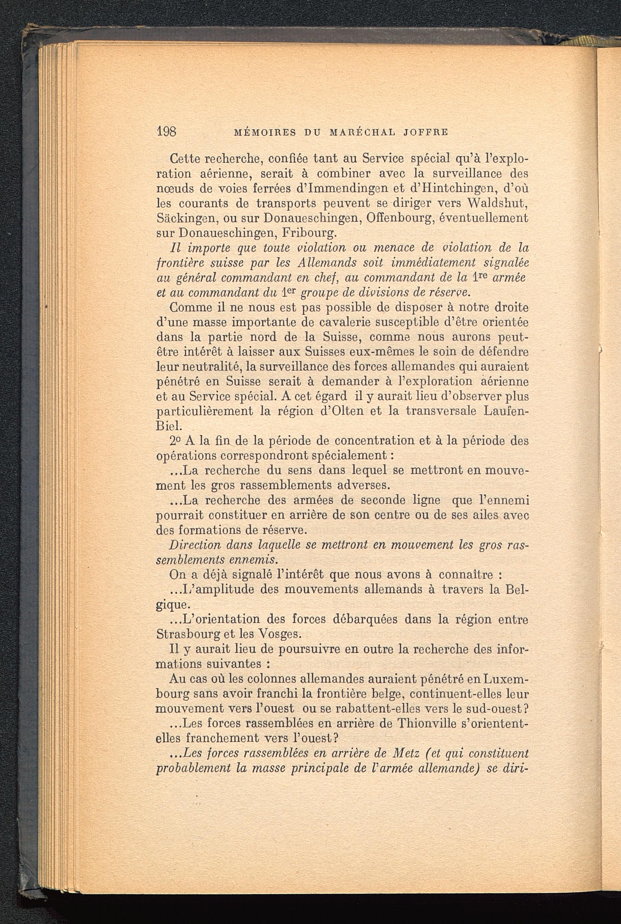 Comme il ne nous est pas possible de disposer à notre droited’une masse importante de cavalerie susceptible d’être orientéedans la partie nord de la Suisse, comme nous aurons peut-être intérêt à laisser aux Suisses eux-mêmes le soin de défendreleur neutralité, la surveillance des forces allemandes qui auraientpénétré en Suisse serait à demander à l’exploration aérienneet au Service spécial. A cet égard il y aurait lieu d’observer plusparticulièrement la région d’Olten et la transversale Laufen-Biel.