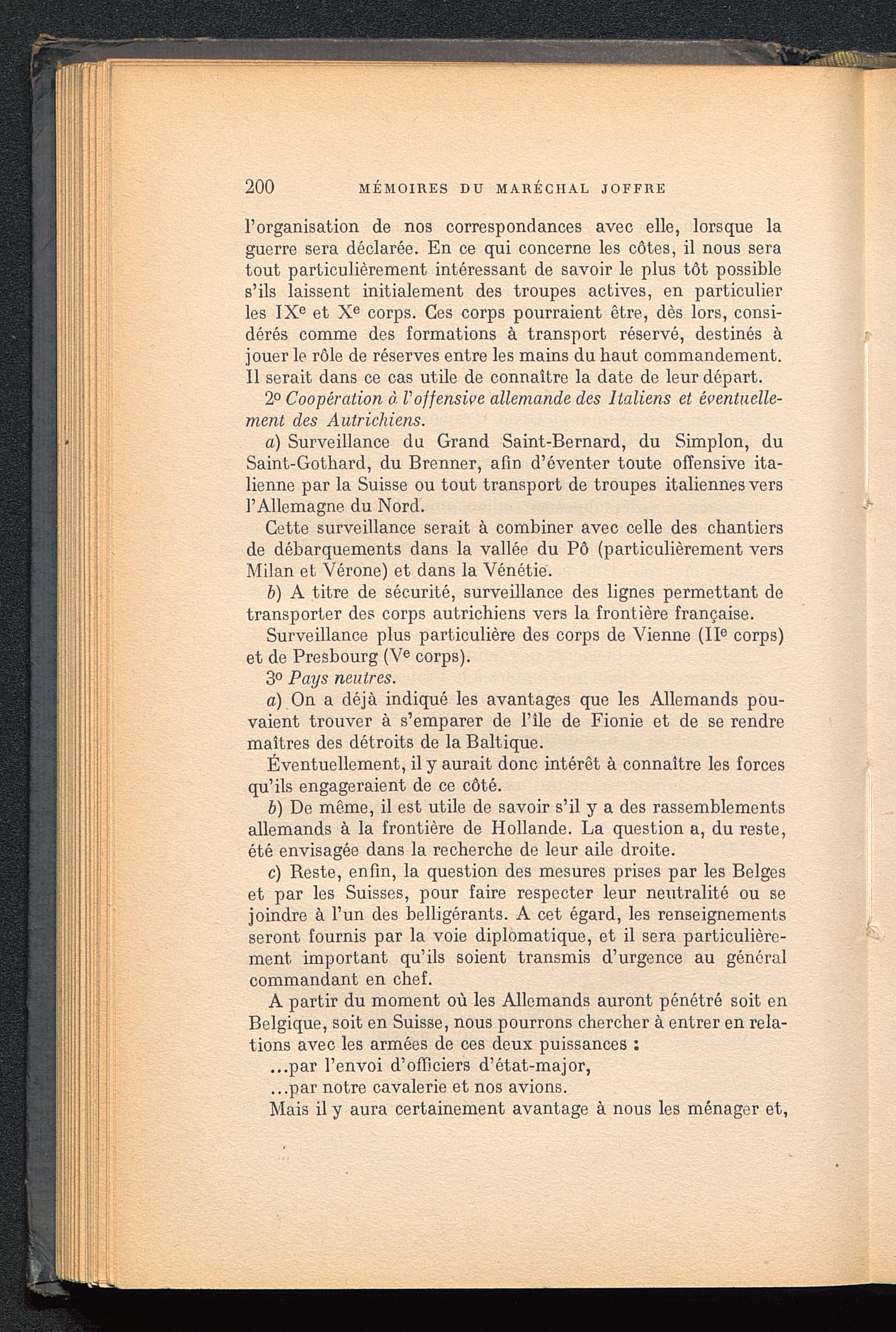 c) Reste, enfin, la question des mesures prises par les Belgeset par les Suisses , pour faire respecter leur neutralité ou sejoindre à l’un des belligérants. A cet égard, les renseignementsseront fournis par la voie diplomatique, et il sera particulière-ment important qu’ils soient transmis d’urgence au généralcommandant en chef.