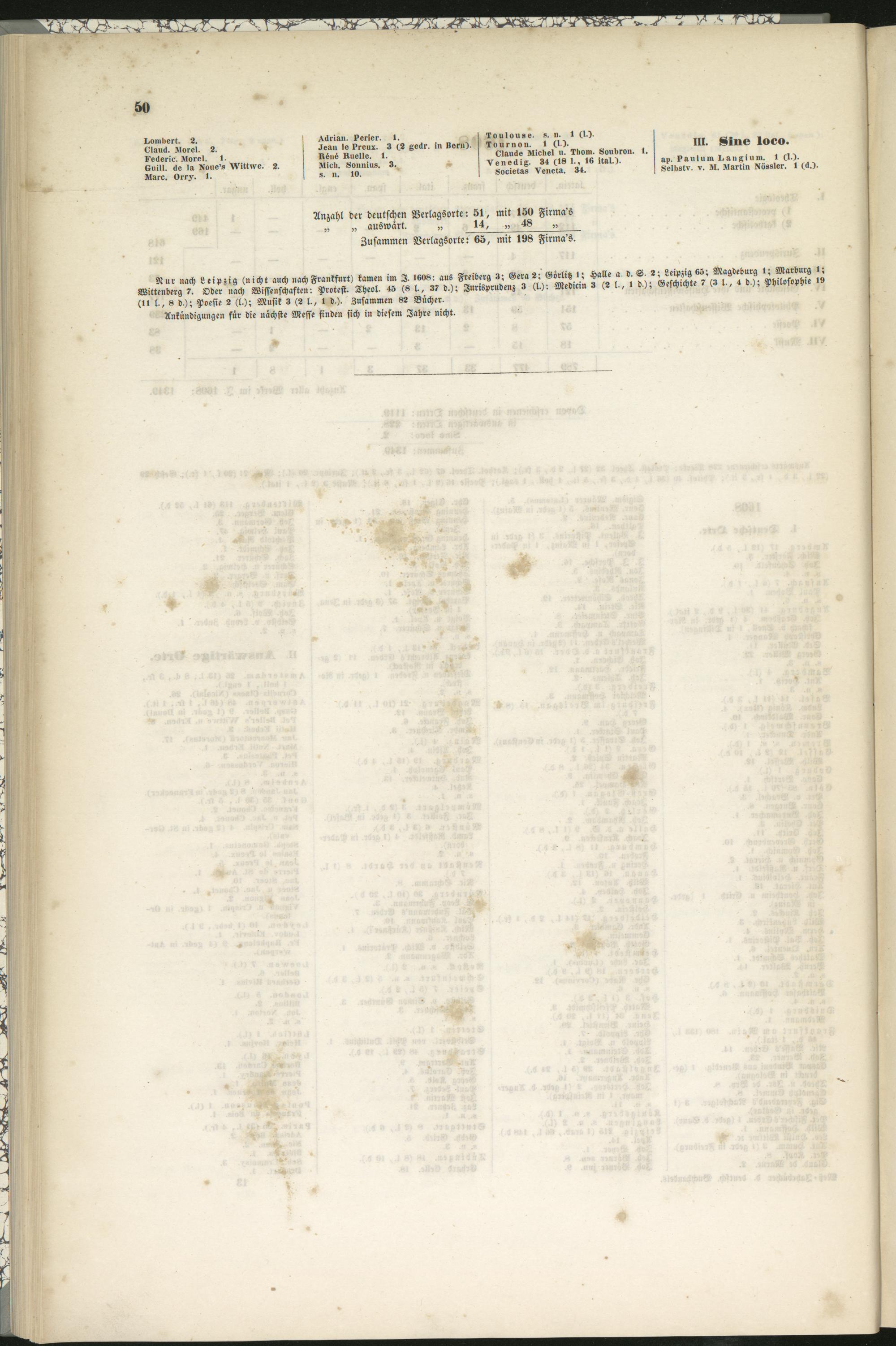 Nur nach Leipzig (nicht auch nach Frankfurt) kamen im I. 1608: aus Freiberg 3; Gera2; Görlitz l; Halle a d. S. 2; Leipzig 65; Magdeburg 1; Marburg 1;Wittenberg 7. Oder nach Wissenschaften: Protest. Theol- 4S (8 l., 37 d.); Jurisprudenz 3 (l.): Medicin 3 (2 l-, I d.); Geschichte 7 (3 l., 4 d.); Philosophie IS(II l., 8 d.); Poesie S (l.); Musik 3 (2 l., l d.). Zusammen 82 Bücher.Ankündigungen für die nächste Messe finden sich in diesem Jahre nicht.