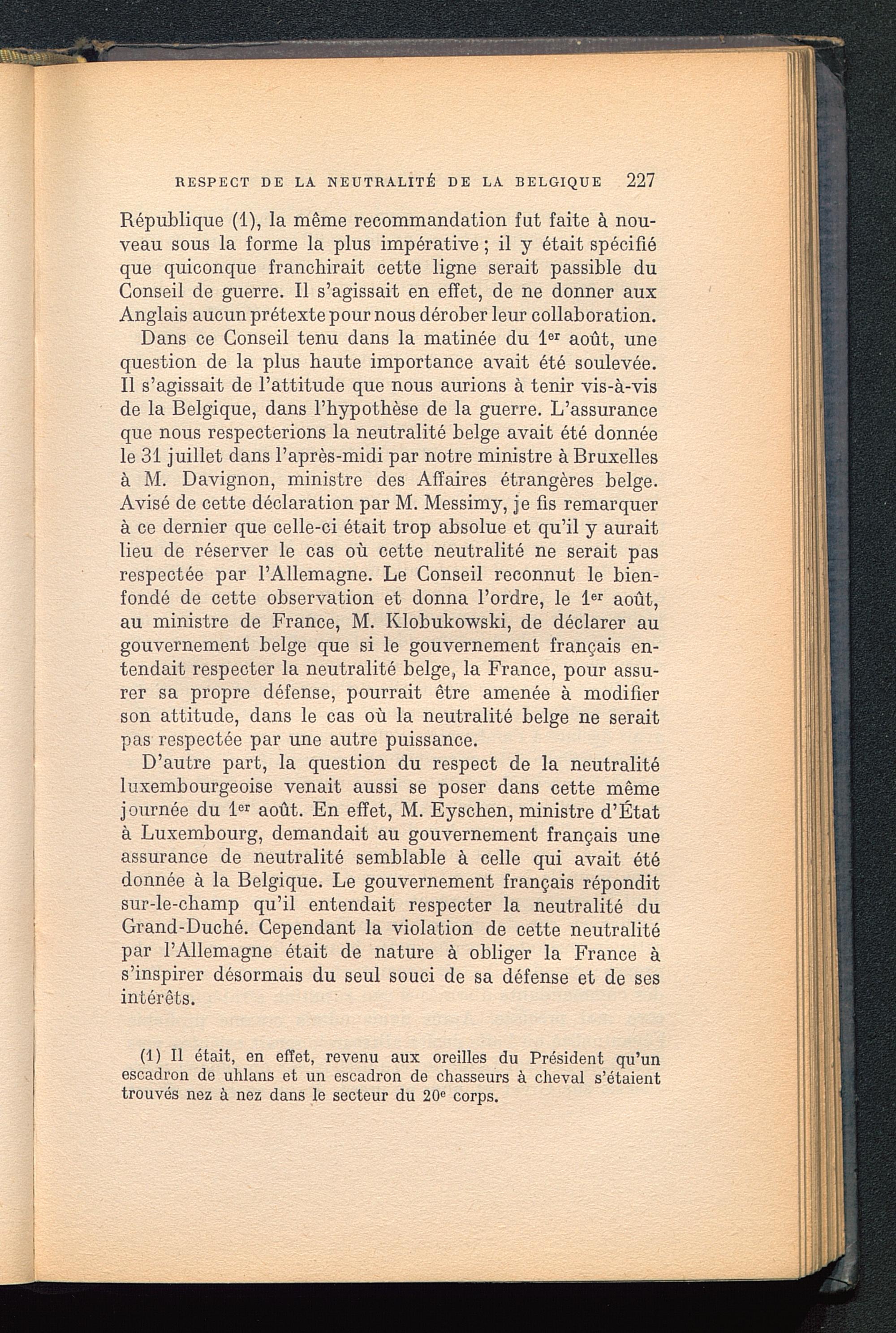 D’autre part, la question du respect de la neutralitéluxembourgeoise venait aussi se poser dans cette mêmejournée du 1 er août. En effet, M. Eyschen, ministre d’Etatà Luxembourg, demandait au gouvernement français uneassurance de neutralité semblable à celle qui avait étédonnée à la Belgique . Le gouvernement français réponditsur-le-champ qu’il entendait respecter la neutralité duGrand-Duché. Cependant la violation de cette neutralitépar l’Allemagne était de nature à obliger la France às’inspirer désormais du seul souci de sa défense et de sesintérêts.