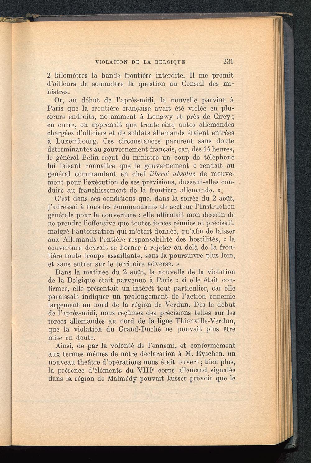 Dans la matinée du 2 août, la nouvelle de la violationde la Belgique était parvenue à Paris : si elle était con-firmée, elle présentait un intérêt tout particulier, car elleparaissait indiquer un prolongement de l’action ennemielargement au nord de la région de Verdun. Dès le débutde l’après-midi, nous reçûmes des précisions telles sur lesforces allemandes au nord de la ligne Thionville-Verdun, que la violation du Grand-Duché ne pouvait plus êtremise en doute.
