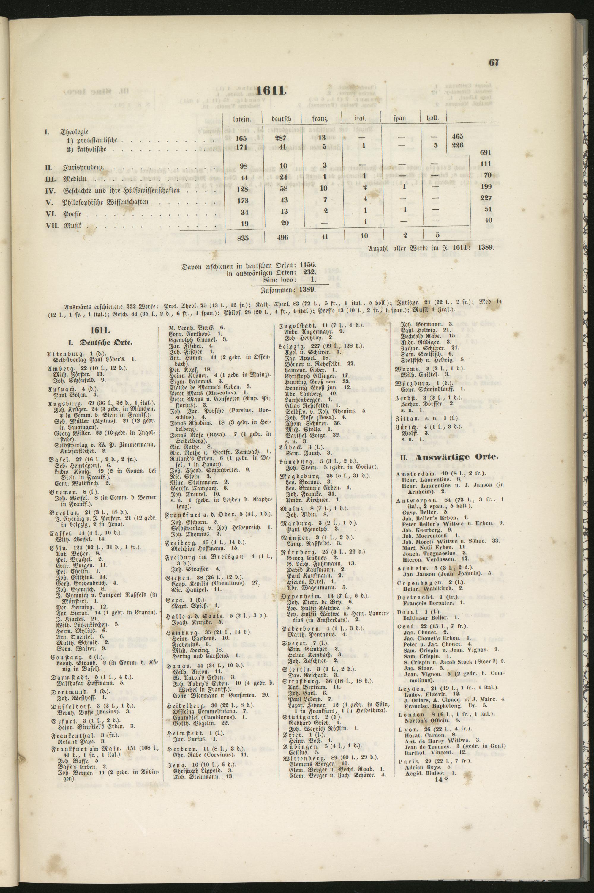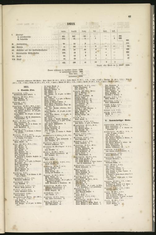 Auswärts erschienene 232 Werke: Prot. Theol. 25 (13 l-, 12 fr.); Kath. Theol. 83 (72 l,, 5 fr., I ital., 5 holl ); Jurispr. 24 (22 l,, S fr); M«(12 l., i fr, l ital.); Gesch. 44 (35 l., 2 d., «fr., l span.); Philos. 28 (20 l., 4 fr-, 4 ital.); Poesie 13 (io l., 2 fr., i span.); Musik l (ital ).