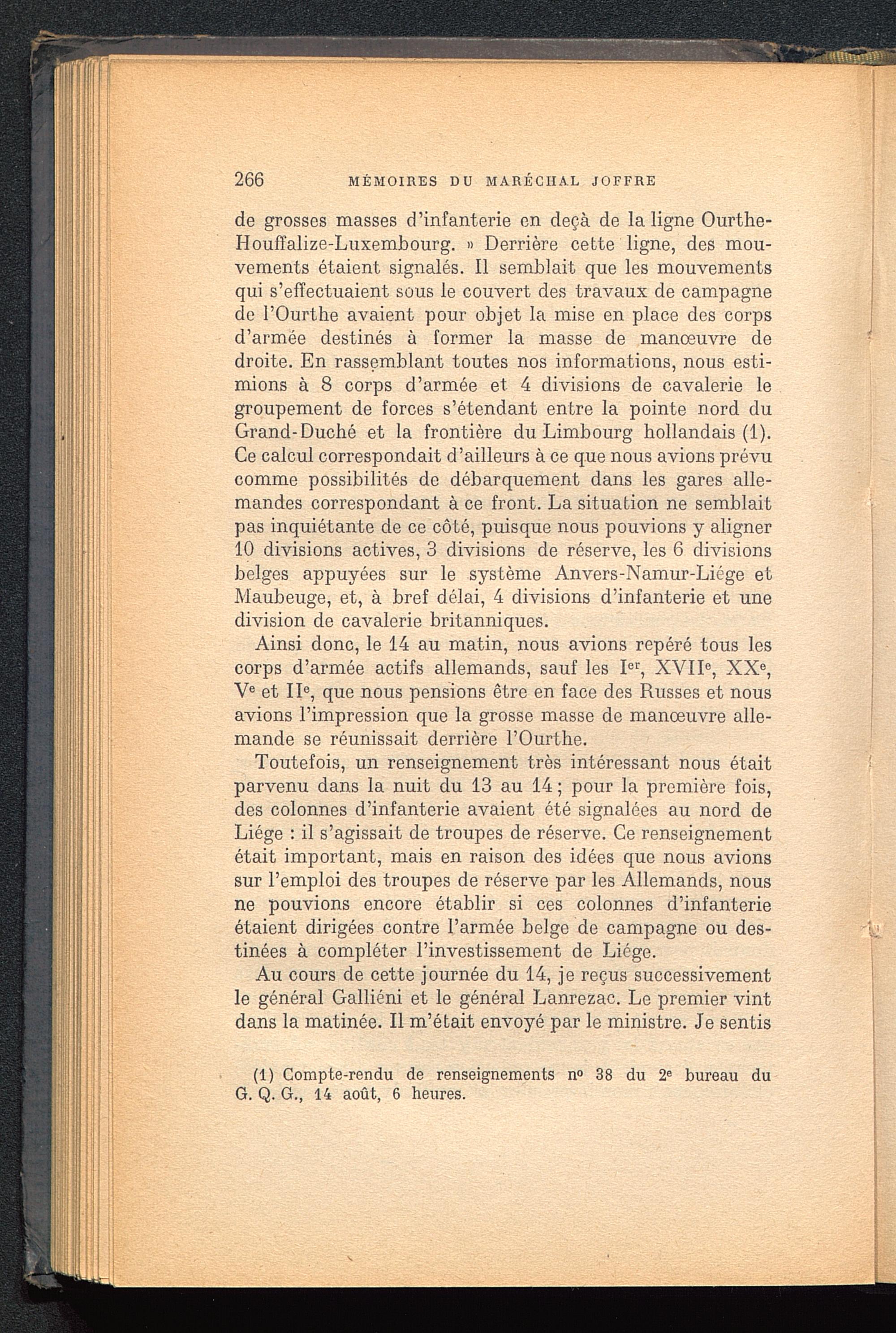 Ainsi donc, le 14 au matin, nous avions repéré tous lescorps d’armée actifs allemands, sauf les I er , XVII e , XX e ,V e et II e , que nous pensions être en face des Russes et nousavions l’impression que la grosse masse de manœuvre alle-mande se réunissait derrière l’Ourthe.