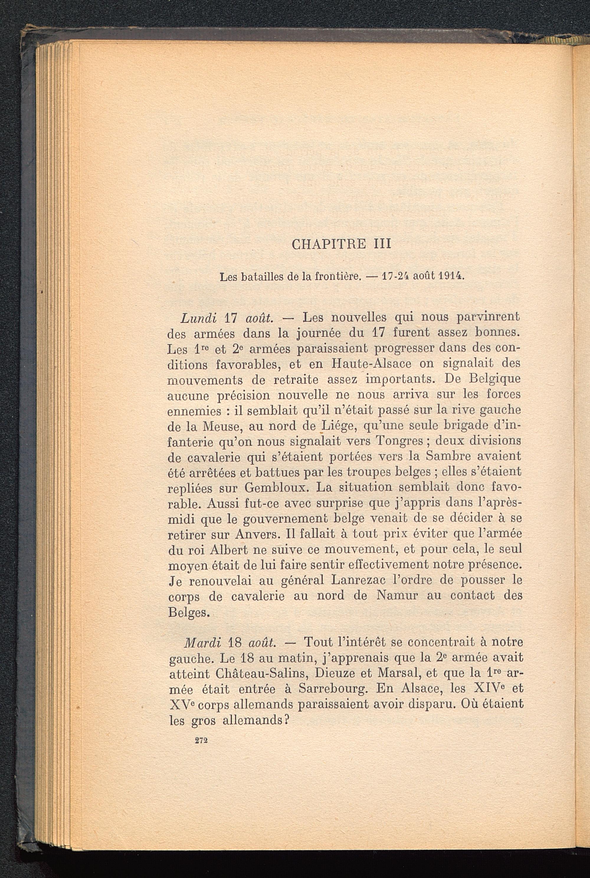 Lundi 17 août. — Les nouvelles qui nous parvinrentdes armées dans la journée du 17 furent assez bonnes.Les l re et 2° armées paraissaient progresser dans des con-ditions favorables, et en Haute-Alsace on signalait desmouvements de retraite assez importants. De Belgique aucune précision nouvelle ne nous arriva sur les forcesennemies : il semblait qu’il n’était passé sur la rive gauchede la Meuse, au nord de Liège , qu’une seule brigade d’in-fanterie qu’on nous signalait vers Tongres ; deux divisionsde cavalerie qui s’étaient portées vers la Sambre avaientété arrêtées et battues par les troupes belges ; elles s’étaientrepliées sur Gembloux . La situation semblait donc favo-rable. Aussi fut-ce avec surprise que j’appris dans l’après-midi que le gouvernement belge venait de se décider à seretirer sur Anvers . Il fallait à tout prix éviter que l’arméedu roi Albert ne suive ce mouvement, et pour cela, le seulmoyen était de lui faire sentir effectivement notre présence.Je renouvelai au général Lanrezac l’ordre de pousser lecorps de cavalerie au nord de Namur au contact desBelges.