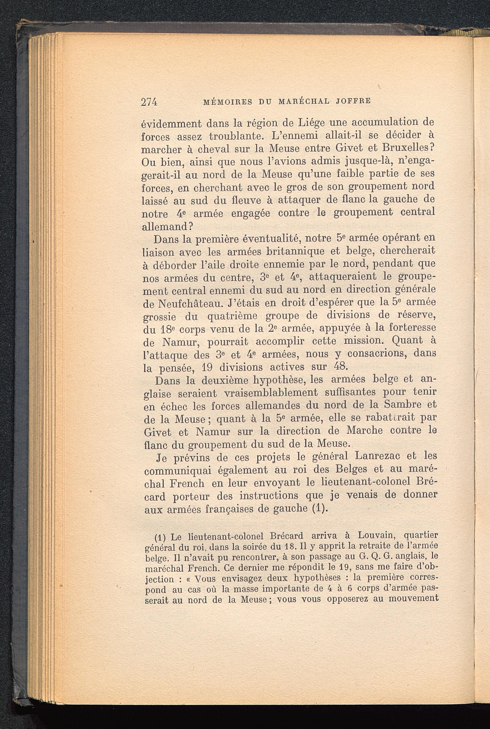 Je prévins de ces projets le général Lanrezac et lescommuniquai également au roi des Belges et au maré-chal French en leur envoyant le lieutenant-colonel Bré-card porteur des instructions que je venais de donneraux armées françaises de gauche (1).