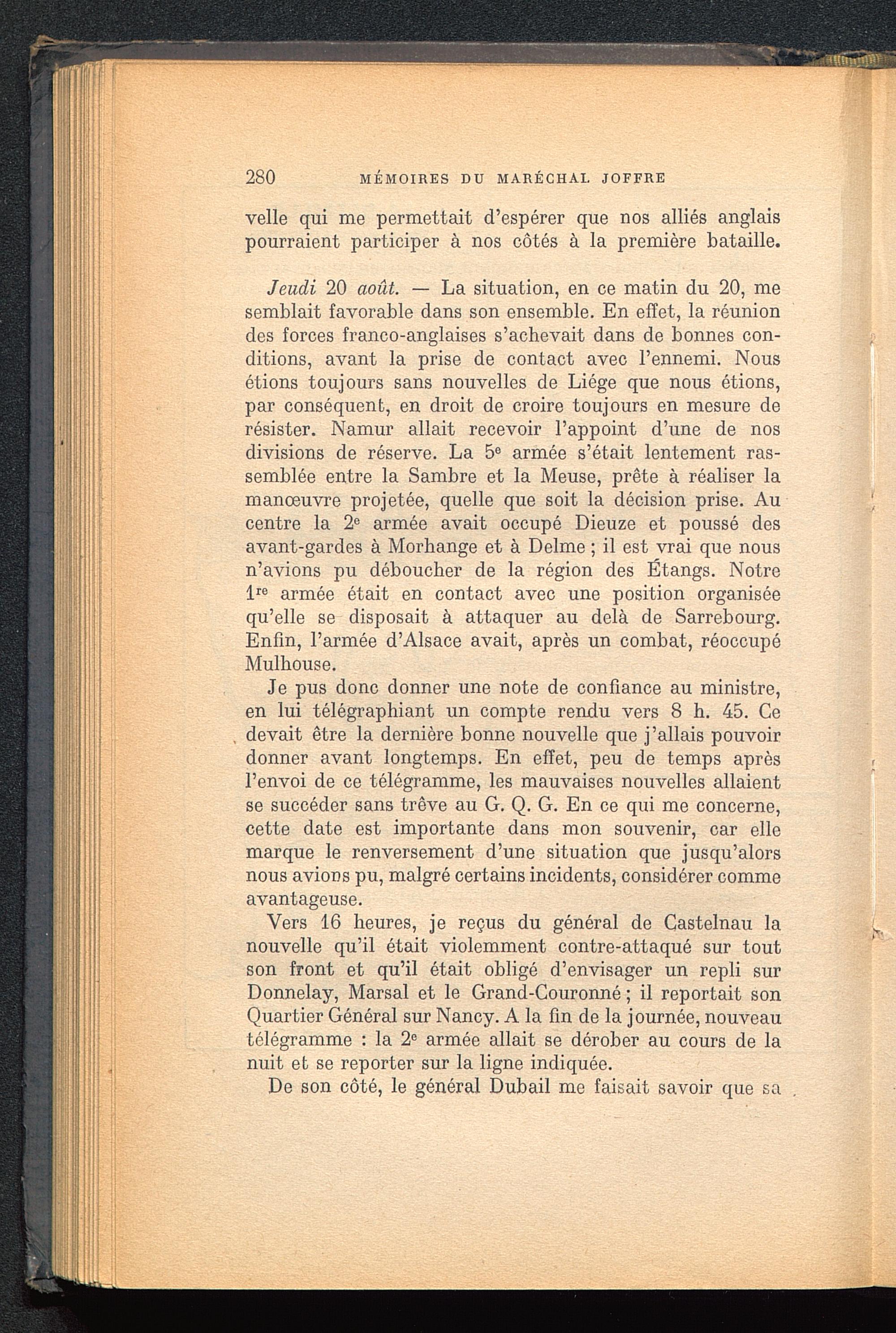 Vers 16 heures, je reçus du général de Castelnau lanouvelle qu’il était violemment contre-attaqué sur toutson front et qu’il était obligé d’envisager un repli surDonnelay, Marsal et le Grand-Couronné ; il reportait sonQuartier Général sur Nancy . A la fin de la journée, nouveautélégramme : la 2 e armée allait se dérober au cours de lanuit et se reporter sur la ligne indiquée.