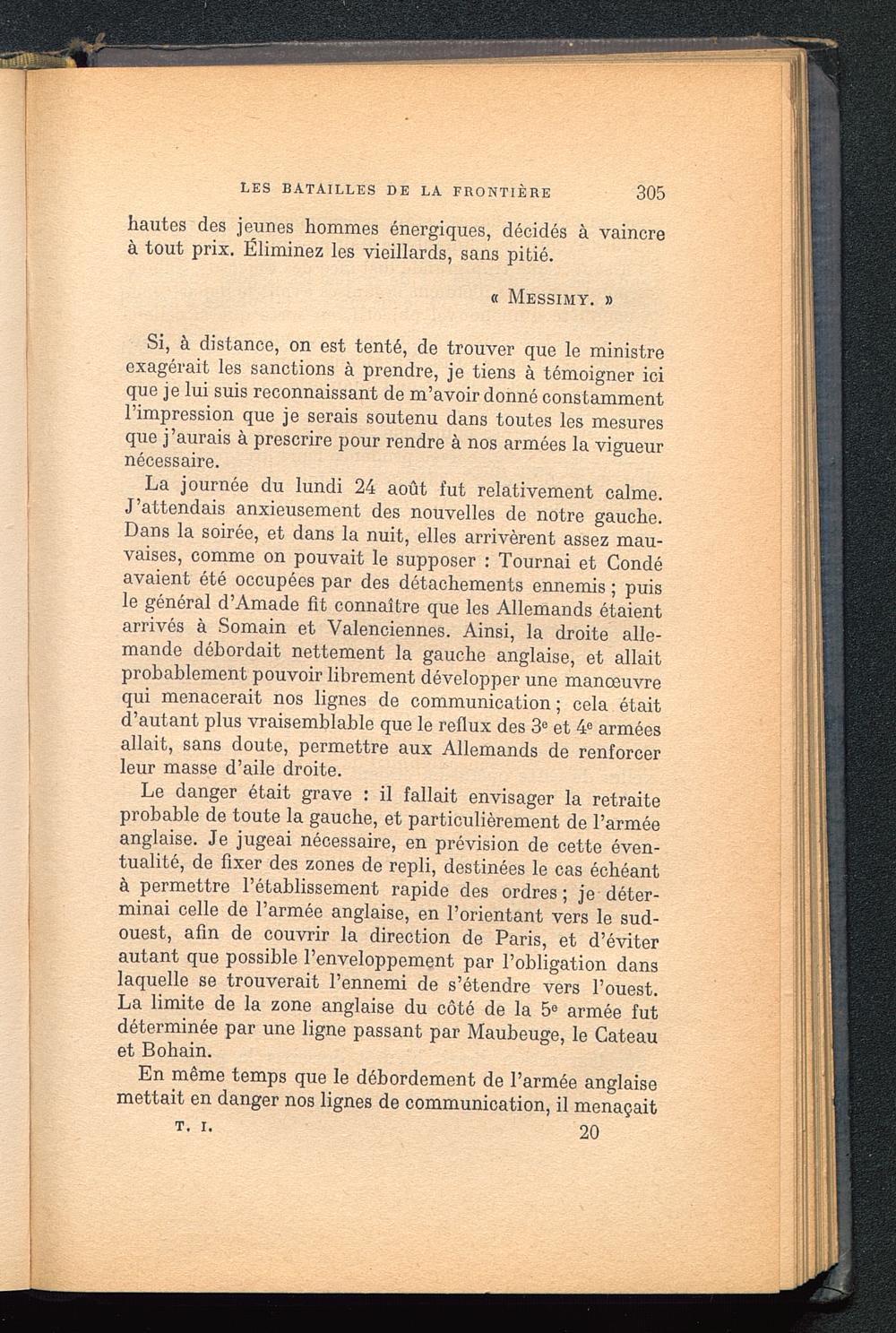 La journée du lundi 24 août fut relativement calme.J’attendais anxieusement des nouvelles de notre gauche.Dans la soirée, et dans la nuit, elles arrivèrent assez mau-vaises, comme on pouvait le supposer : Tournai et Condéavaient été occupées par des détachements ennemis ; puisle général d’Amade fit connaître que les Allemands étaientarrivés à Somain et Valenciennes. Ainsi, la droite alle-mande débordait nettement la gauche anglaise, et allaitprobablement pouvoir librement développer une manœuvrequi menacerait nos lignes de communication ; cela étaitd’autant plus vraisemblable que le reflux des 3 e et 4 e arméesallait, sans doute, permettre aux Allemands de renforcerleur masse d’aile droite.