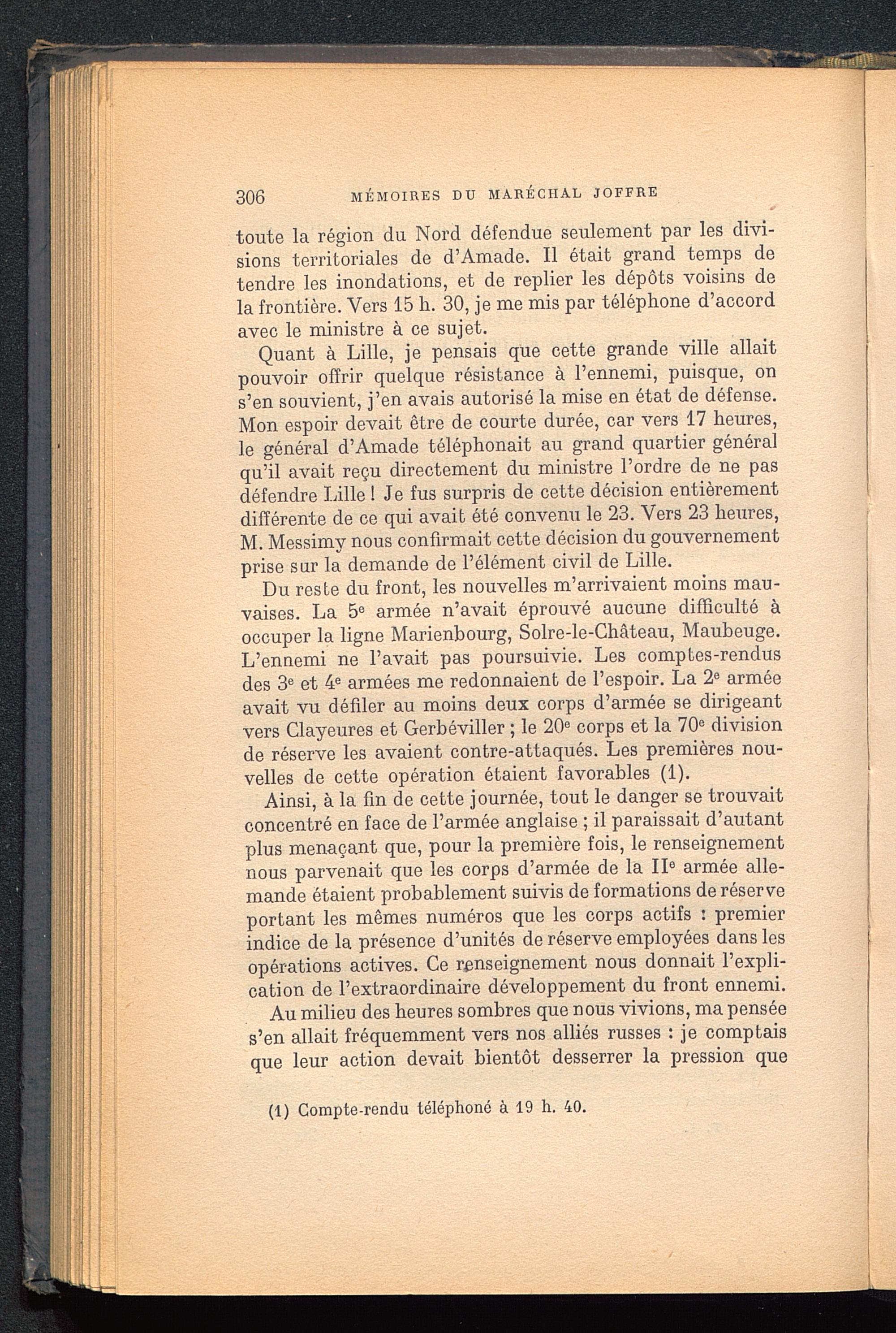 toute la région du Nord défendue seulement par les divi-sions territoriales de d’Amade. Il était grand temps detendre les inondations, et de replier les dépôts voisins dela frontière. Vers 15 h. 30, je me mis par téléphone d’accordavec le ministre à ce sujet.