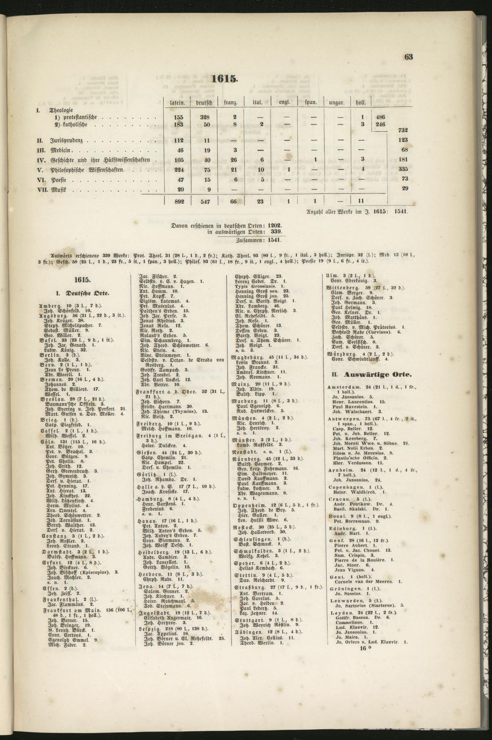 Auswärts erschienene 339 Werke: Prot. Theol. 31 (28 l-, 1 d., S fr.); Kath. Theol. 93 (80 l-, »fr-, > ital., 3 holl); Jurispr. 32 (l,S fr.); Gesch. S8 (2S l., t d., 23 fr., S it., I span., 3 holl.); Philos. 93 (61 l., 18 fr., 9 it., I engl., 4 holl); Poesie «9 (9 l., « fr., 4 it.).