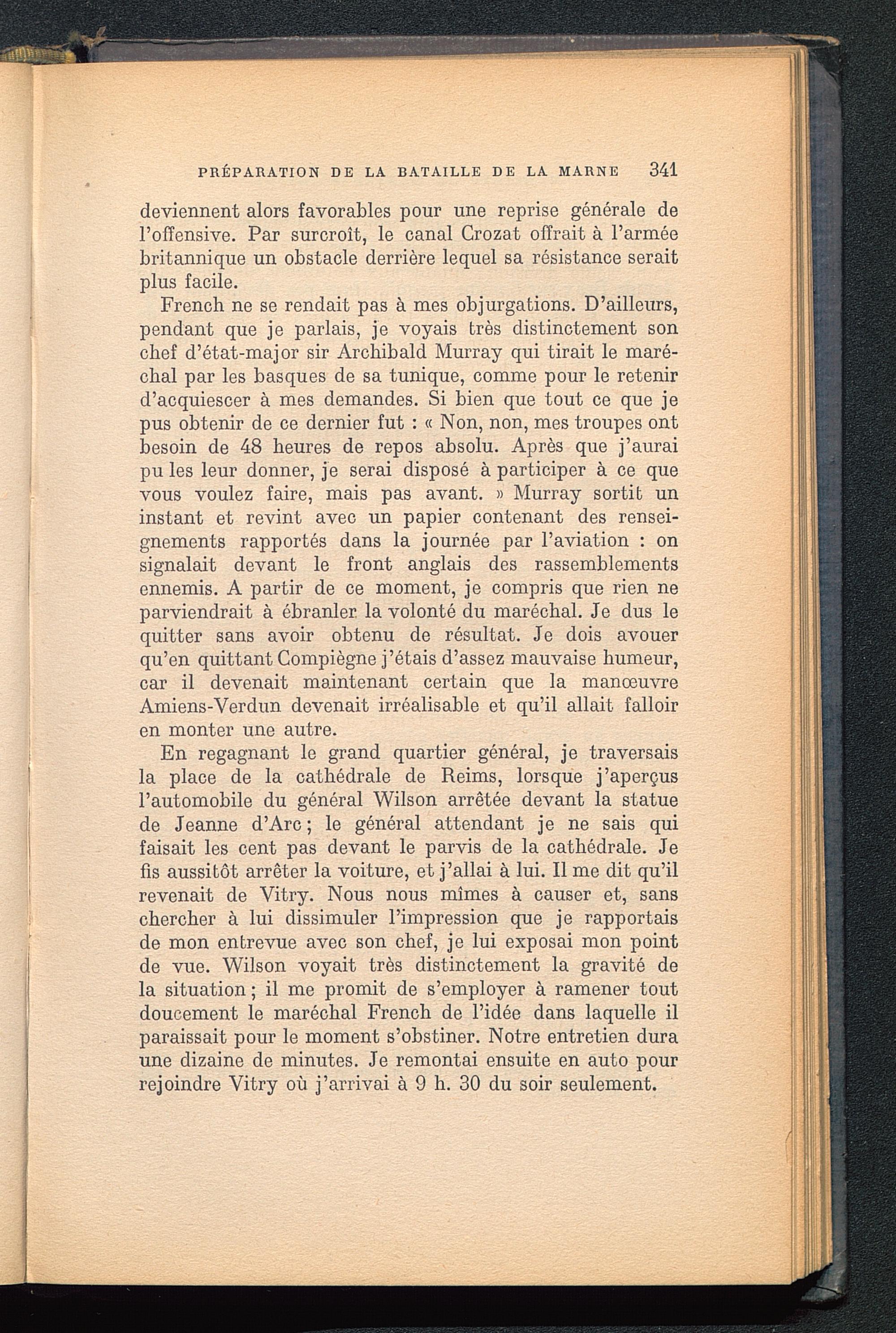 En regagnant le grand quartier général, je traversaisla place de la cathédrale de Reims, lorsque j’aperçusl’automobile du général Wilson arrêtée devant la statuede Jeanne d’Arc ; le général attendant je ne sais quifaisait les cent pas devant le parvis de la cathédrale. Jefis aussitôt arrêter la voiture, et j’allai à lui. Il me dit qu’ilrevenait de Vitry . Nous nous mîmes à causer et, sanschercher à lui dissimuler l’impression que je rapportaisde mon entrevue avec son chef, je lui exposai mon pointde vue. Wilson voyait très distinctement la gravité dela situation ; il me promit de s’employer à ramener toutdoucement le maréchal French de l’idée dans laquelle ilparaissait pour le moment s’obstiner. Notre entretien duraune dizaine de minutes. Je remontai ensuite en auto pourrejoindre Vitry où j’arrivai à 9 h. 30 du soir seulement.