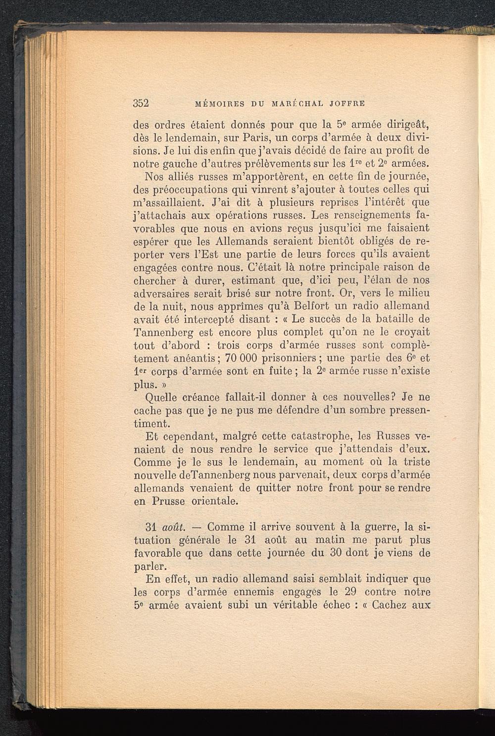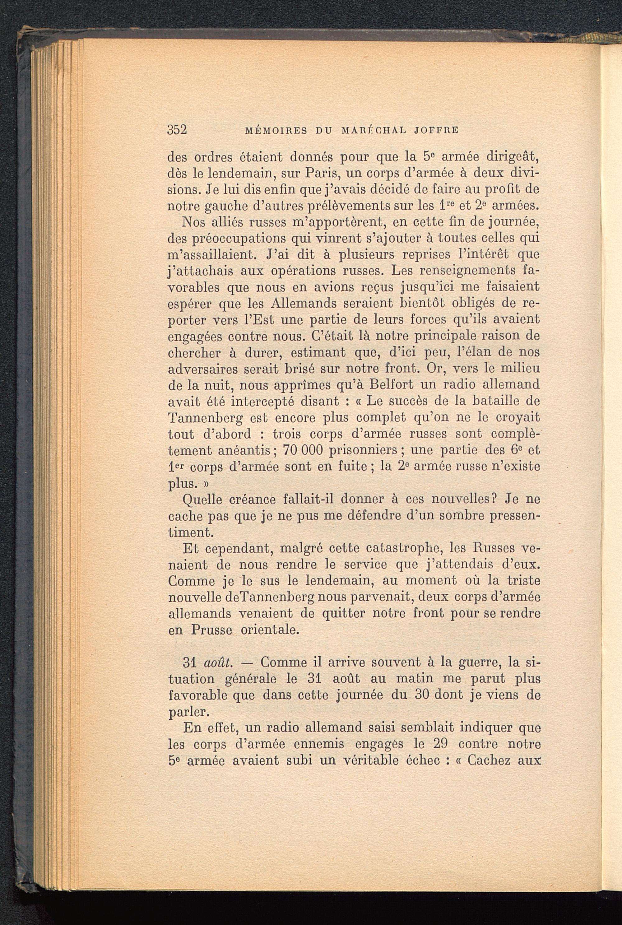 Nos alliés russes m’apportèrent, en cette fin de journée,des préoccupations qui vinrent s’ajouter à toutes celles quim’assaillaient. J’ai dit à plusieurs reprises l’intérêt quej’attachais aux opérations russes. Les renseignements fa-vorables que nous en avions reçus jusqu’ici me faisaientespérer que les Allemands seraient bientôt obligés de re-porter vers l’Est une partie de leurs forces qu’ils avaientengagées contre nous. C’était là notre principale raison dechercher à durer, estimant que, d’ici peu, l’élan de nosadversaires serait brisé sur notre front. Or, vers le milieude la nuit, nous apprîmes qu’à Belfort un radio allemandavait été intercepté disant : « Le succès de la bataille deTannenberg est encore plus complet qu’on ne le croyaittout d’abord : trois corps d’armée russes sont complè-tement anéantis ; 70 000 prisonniers ; une partie des 6° et1 er corps d’armée sont en fuite ; la 2° armée russe n’existeplus. »