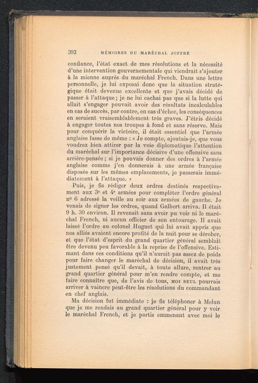 Ma décision fut immédiate : je fis téléphoner à Melun que je me rendais au grand quartier général pour y voirle maréchal French, et je partis emmenant avec moi le