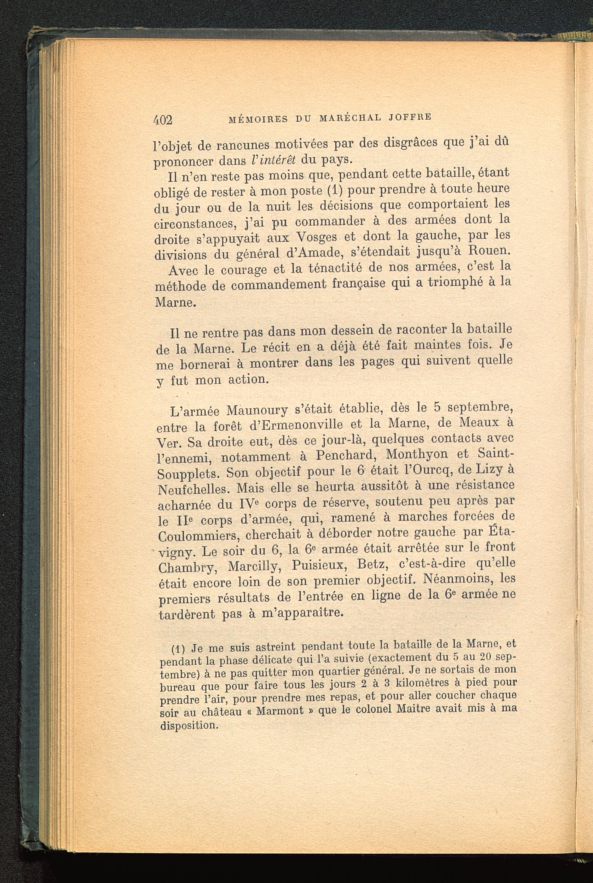 (1) Je me suis astreint pendant toute la bataille de la Marne , etpendant la phase délicate qui l’a suivie (exactement du 5 au 20 sep-tembre) à ne pas quitter mon quartier général. Je ne sortais de monbureau que pour faire tous les jours 2 à 3 kilomètres à pied pourprendre l’air, pour prendre mes repas, et pour aller coucher chaquesoir au château « Marmont » que le colonel Maitre avait mis à madisposition.