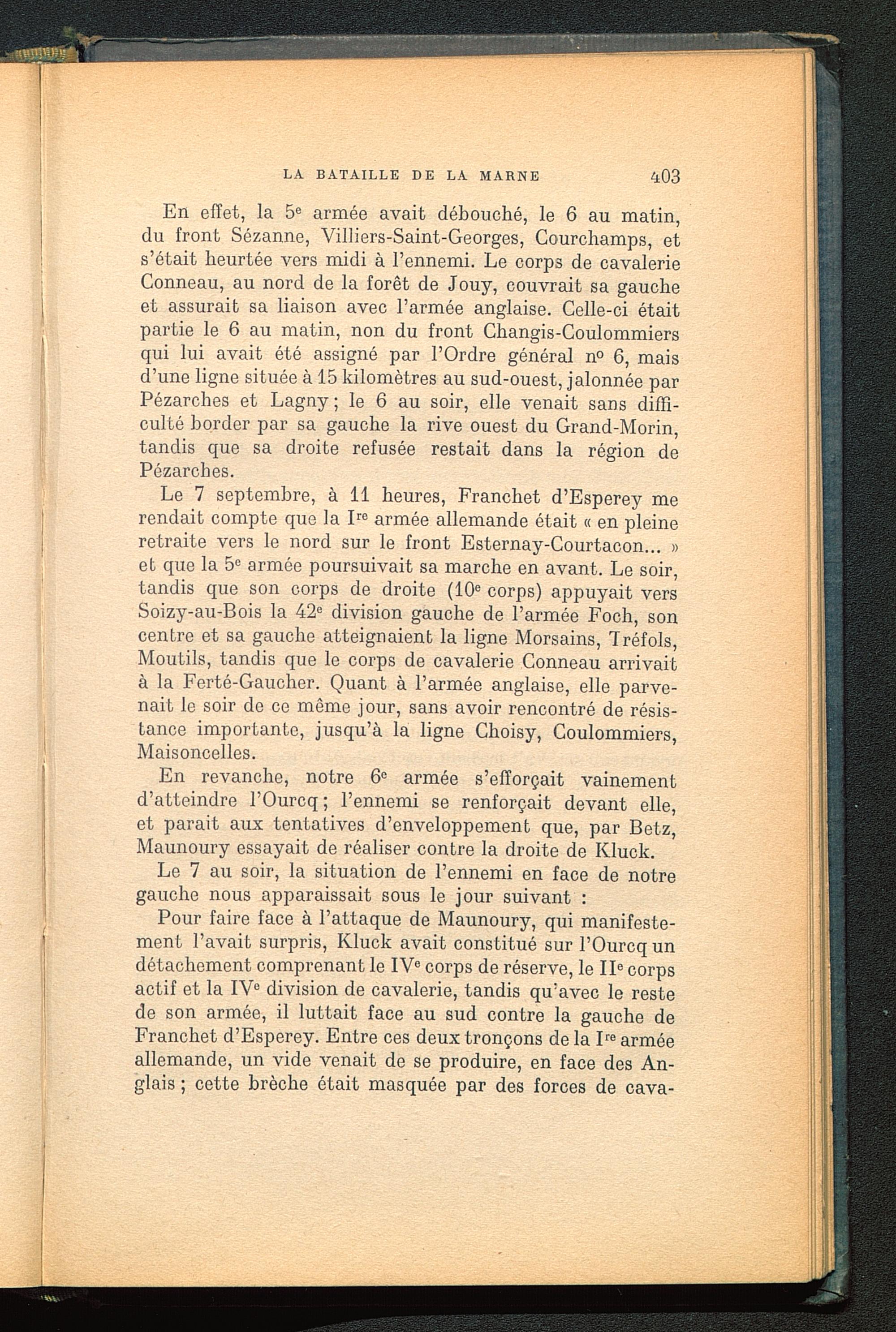 En effet, la 5 e armée avait débouché, le 6 au matin,du front Sézanne, Villiers-Saint-Georges, Courchamps, ets’était heurtée vers midi à l’ennemi. Le corps de cavalerieConneau, au nord de la forêt de Jouy, couvrait sa gaucheet assurait sa liaison avec l’armée anglaise. Celle-ci étaitpartie le 6 au matin, non du front Changis-Coulommiersqui lui avait été assigné par l’Ordre général n° 6, maisd’une ligne située à 15 kilomètres au sud-ouest, jalonnée parPézarches et Lagny ; le 6 au soir, elle venait sans diffi-culté border par sa gauche la rive ouest du Grand-Morin,tandis que sa droite refusée restait dans la région dePézarches.