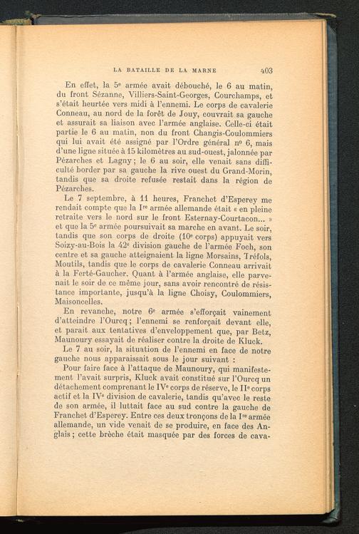 Le 7 septembre, à 11 heures, Franchet d’Esperey merendait compte que la I re armée allemande était « en pleineretraite vers le nord sur le front Esternay -Courtacon... »et que la 5 e armée poursuivait sa marche en avant. Le soir,tandis que son corps de droite (10 e corps) appuyait versSoizy-au-Bois la 42 e division gauche de l’armée Foch, soncentre et sa gauche atteignaient la ligne Morsains, Tréfols,Moutils, tandis que le corps de cavalerie Conneau arrivaità la Ferté-Gaucher. Quant à l’armée anglaise, elle parve-nait le soir de ce même jour, sans avoir rencontré de résis-tance importante, jusqu’à la ligne Choisy, Goulommiers,Maisoncelles.