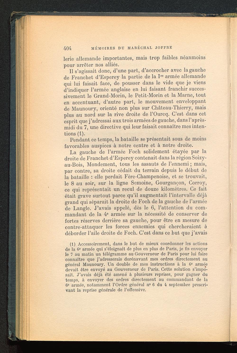 (1) Accessoirement, dans le but de mieux coordonner les actionsde la 6° armée qui s’éloignait de plus en plus de Paris, je fis envoyerle 7 au matin un télégramme au Gouverneur de Paris pour lui faireconnaître que j’adresserais dorénavant mes ordres directement augénéral Maunoury. Un double de mes instructions à la 6 e arméedevait être envoyé au Gouverneur de Paris. Cette solution s’impo-sait. J’avais déjà été amené à plusieurs reprises, pour gagner dutemps, à envoyer des ordres directement au commandant de la6 e armée, notamment l’Ordre général n° 6 du 4 septembre prescri-vant la reprise générale de l’offensive.
