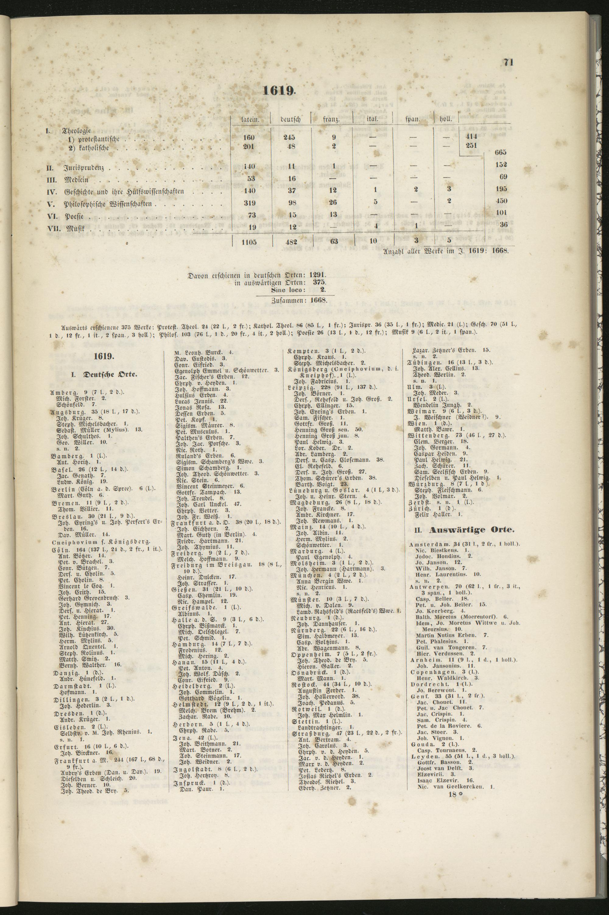 Auswärts erschienene 375 Werke: Protest. Theol, 24 (22 l., 2 fr); Kathol. Theol. ««(«St., l fr.); Jurispr, 3« (35 l,, t fr.); M-dic. 21 (l.); Gesch. 7« (51 l.,d,, 12 fr., l it,, 2 span,, 3 holt); Philos. 103 (7« l., I d., 2» fr., 4 it., 2 holl ); Poesie 2« (13 l,, I d., 12 fr.); Musik s (« l., 2 it., I span.).