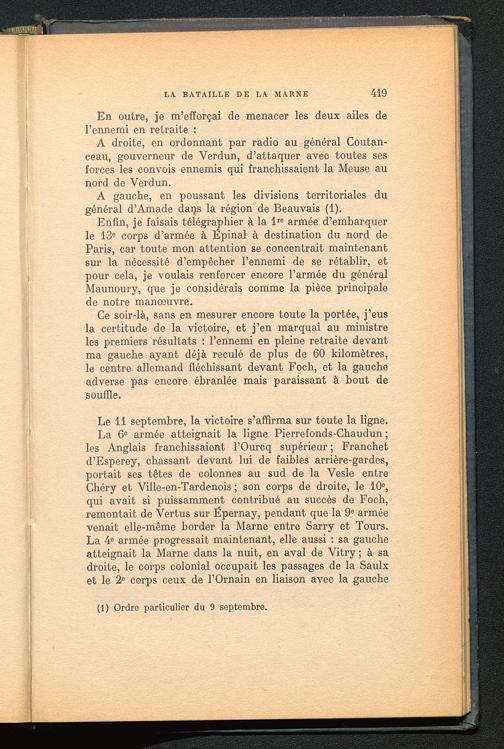 Ce soir-là, sans en mesurer encore toute la portée, j’eusla certitude de la victoire, et j’en marquai au ministreles premiers résultats : l’ennemi en pleine retraite devantma gauche ayant déjà reculé de plus de 60 kilomètres,le centre allemand fléchissant devant Foch, et la gaucheadverse pas encore ébranlée mais paraissant à bout desouffle.