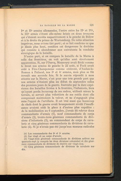 D’autre part, si on compare la bataille de la Marne àcelle des frontières, on voit qu’elles sont étroitementapparentées. Si, sur l’Ourcq, Maunoury avait fléchi commele firent nos armées de gauche le 22 août, si Foch avaitcédé à Fère-Champenoise comme cédèrent, d’Audun-le-Roman à Paliseul, nos 3 e et 4 e armées, mon plan se fûtécroulé une seconde fois. Si le succès répondit à monattente sur la Marne, c’est pour une très grande part quenos armées n’étaient plus au début de septembre cellesdes premiers jours de la guerre. Instruite par la dure expé-rience des batailles livrées à la frontière, l’infanterie, bienqu’ayant perdu beaucoup de ses cadres, utilisait mieux leterrain, se servait plus volontiers de ses outils dont ellecomprenait maintenant la valeur, et ne s’engageait plussans l’appui de l’artillerie. Il est vrai aussi que beaucoupde chefs dont la guerre avait brusquement révélé l’insuffi-sance avaient cédé la place à d’autres plus capables :de la mobilisation au 6 septembre, j’avais dû relever deuxcommandants d’armée (1), neuf commandants de corpsd’armée (2), trente-trois généraux commandants de divi-sions d’infanterie (3), un commandant de corps de cava-lerie et cinq généraux commandants de divisions de cava-lerie (4). Si je n’avais pas été jusqu’aux mesures radicales