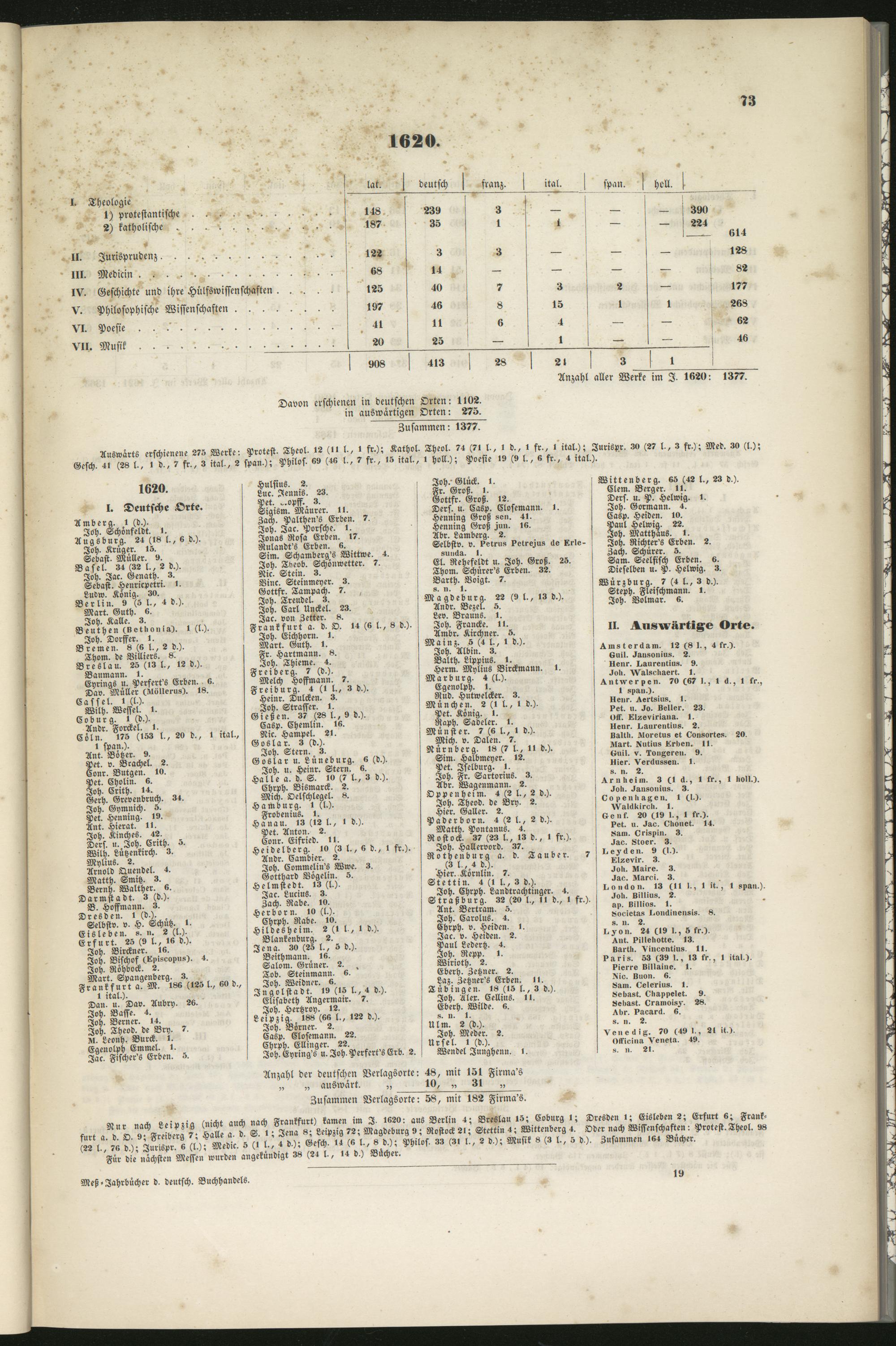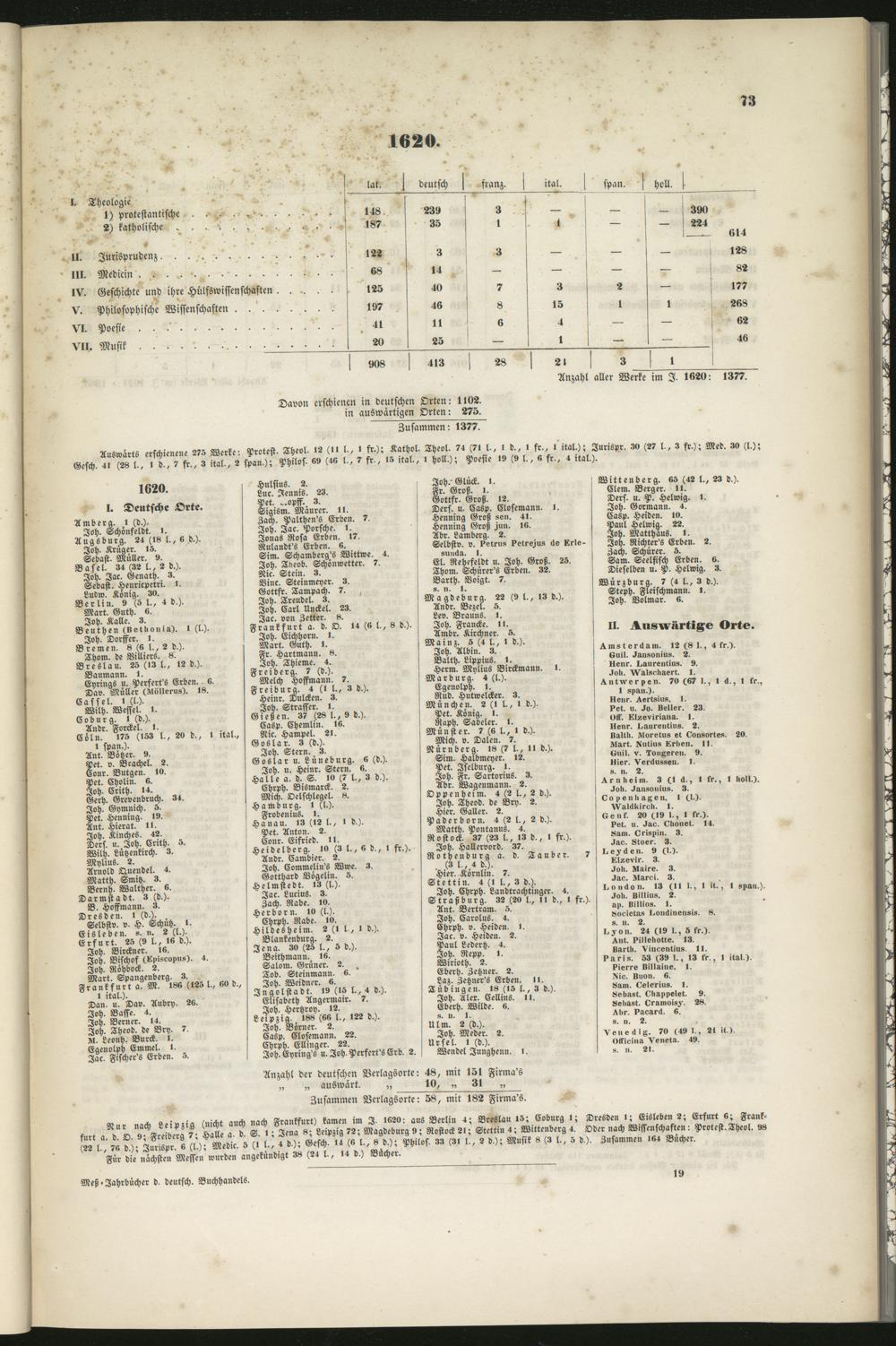 Nur nach Leipzig (nicht auch nach Frankfurt) kamen im I, 1620: aus Berlin 4; Breslau 15; Coburg I; Dresden i; Eisleben 2; Erfurt 6; Frank-furt a. d O, 9' Freibcrg 7; Halle a, d, S. I; Jena 8; Leipzig 72; Magdeburg 9; Rostocks; Stettins Wittenberg 4. Oder nach Wissenschaften: Protest.Theol. 98(22 l , 76 d.); Jurispr. 6 (l.); Medic. 5 (t l., 4 d,); Gesch. 14 (6 l., 8 d.); Philos, 33 (31 l., 2 d.); Musik 8 (3 l., 5 d). Zusammen 164 Bücher.