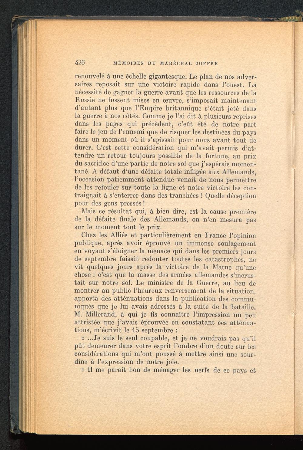 Chez les Alliés et particulièrement en France l’opinionpublique, après avoir éprouvé un immense soulagementen voyant s’éloigner la menace qui dans les premiers joursde septembre faisait redouter toutes les catastrophes, nevit quelques jours après la victoire de la Marne qu’unechose : c’est que la masse des armées allemandes s’incrus-tait sur notre sol. Le ministre de la Guerre, au lieu demontrer au public l’heureux renversement de la situation,apporta des atténuations dans la publication des commu-niqués que je lui avais adressés à la suite de la bataille.M. Millerand, à qui je fis connaître l’impression un peuattristée que j’avais éprouvée en constatant ces atténua-tions, m’écrivit le 15 septembre :