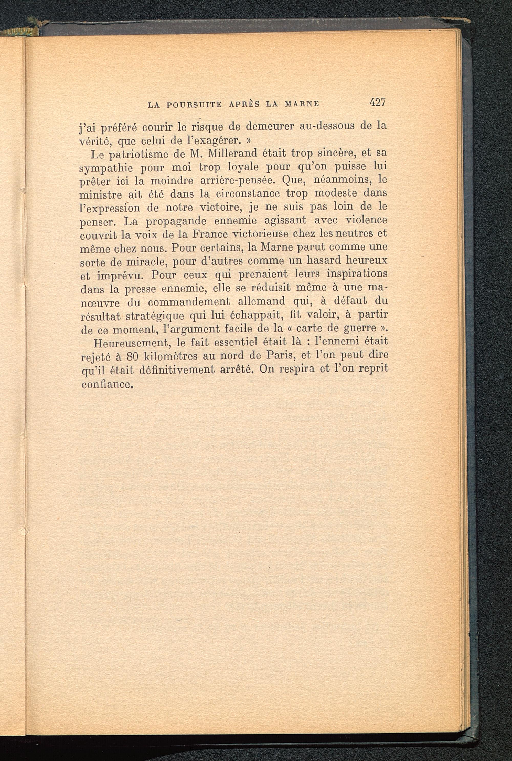 Heureusement, le fait essentiel était là : l’ennemi étaitrejeté à 80 kilomètres au nord de Paris , et l’on peut direqu’il était définitivement arrêté. On respira et l’on repritconfiance.