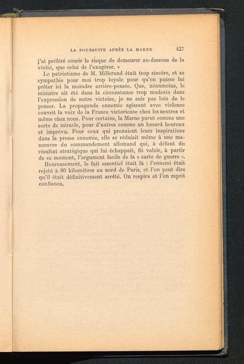 Le patriotisme de M. Millerand était trop sincère, et sasympathie pour moi trop loyale pour qu’on puisse luiprêter ici la moindre arrière-pensée. Que, néanmoins, leministre ait été dans la circonstance trop modeste dansl’expression de notre victoire, je ne suis pas loin de lepenser. La propagande ennemie agissant avec violencecouvrit la voix de la France victorieuse chez les neutres etmême chez nous. Pour certains, la Marne parut comme unesorte de miracle, pour d’autres comme un hasard heureuxet imprévu. Pour ceux qui prenaient leurs inspirationsdans la presse ennemie, elle se réduisit même à une ma-nœuvre du commandement allemand qui, à défaut durésultat stratégique qui lui échappait, fit valoir, à partirde ce moment, l’argument facile de la « carte de guerre ».