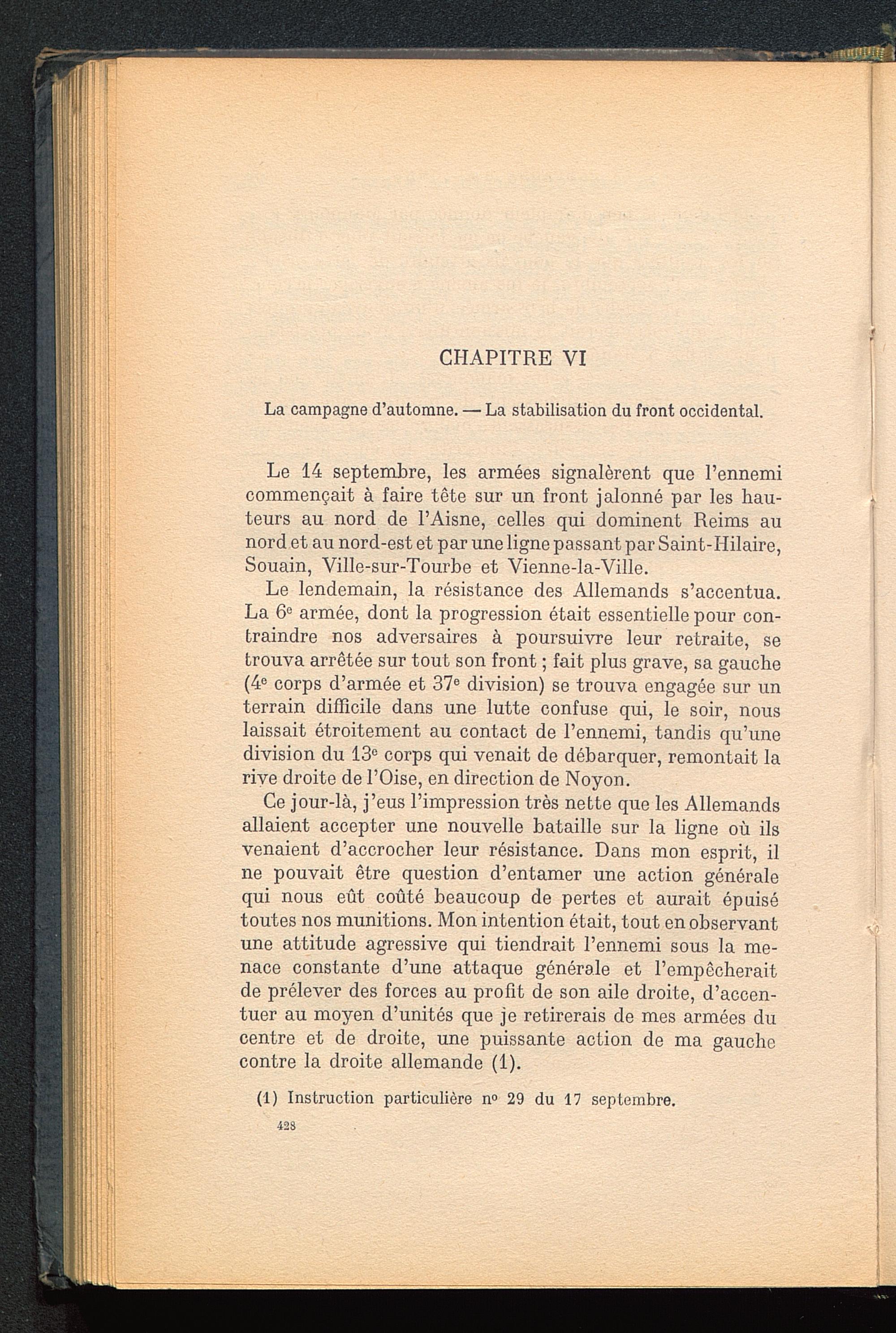 Le 14 septembre, les armées signalèrent que l’ennemicommençait à faire tête sur un front jalonné par les hau-teurs au nord de l’Aisne, celles qui dominent Reims aunord et au nord-est et par une ligne passant par Saint-Hilaire,Souain , Ville-sur-Tourbe et Vienne-la-Ville.