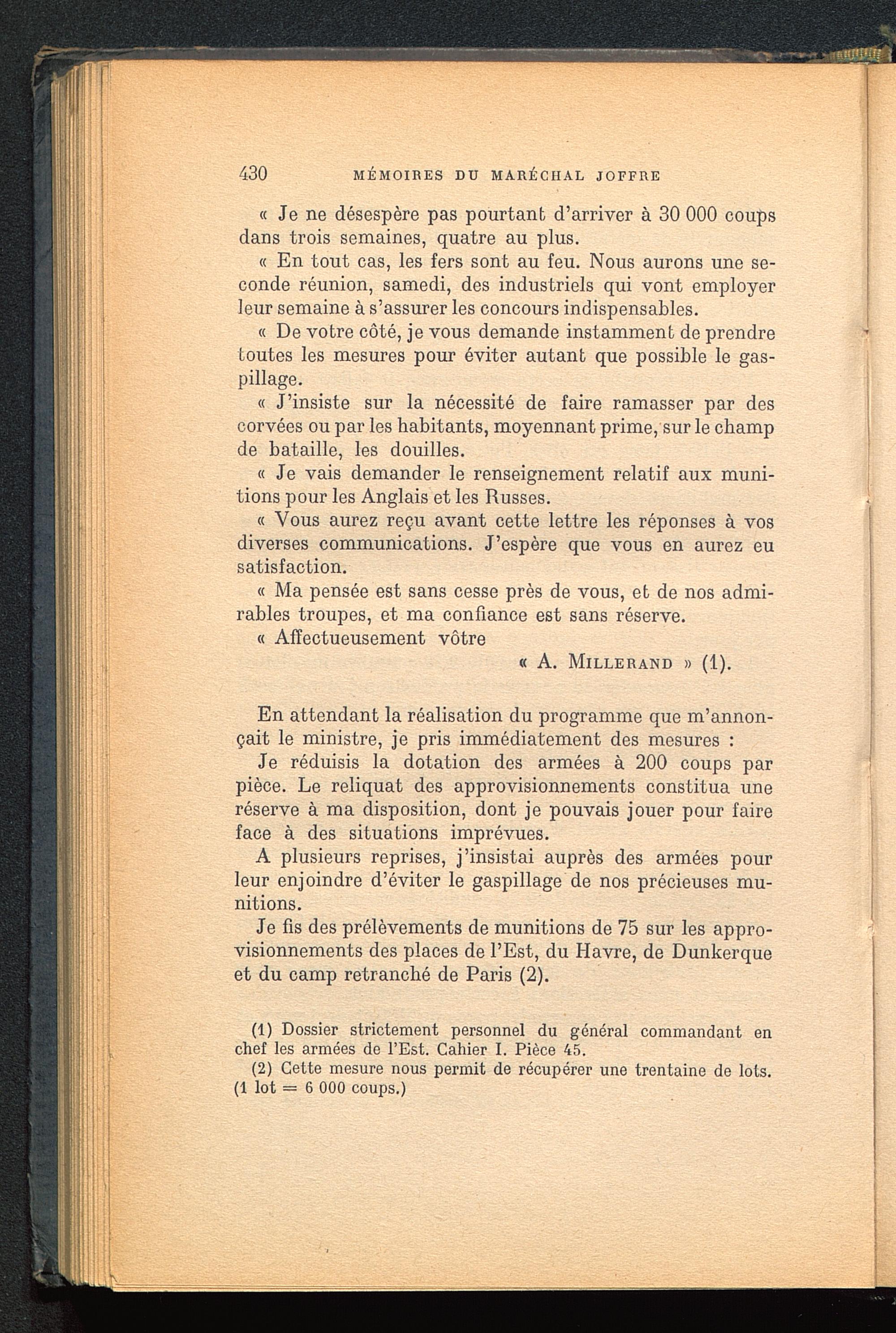 Je fis des prélèvements de munitions de 75 sur les appro-visionnements des places de l’Est, du Havre, de Dunkerque et du camp retranché de Paris (2).