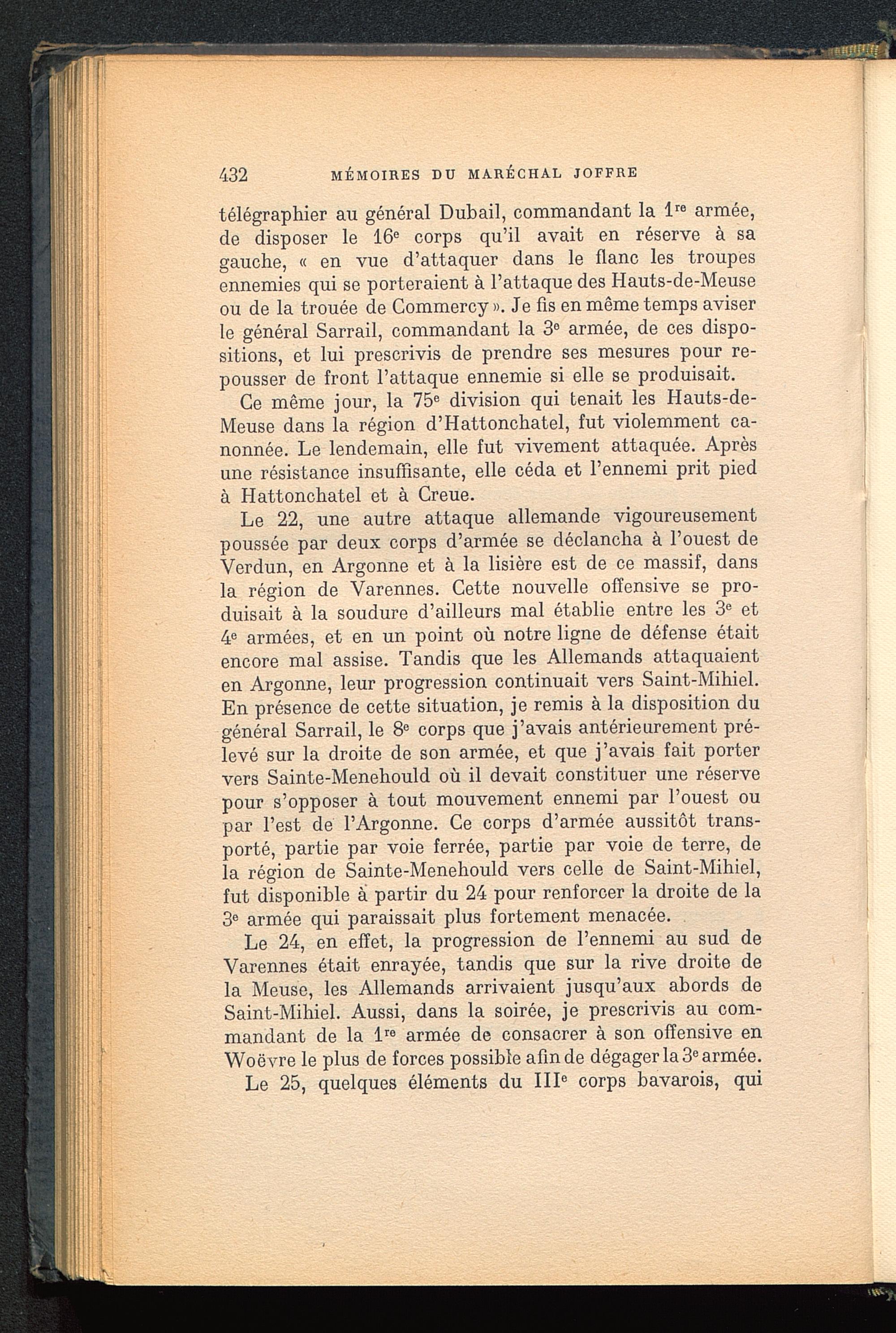 Le 24, en effet, la progression de l’ennemi au sud deVarennes était enrayée, tandis que sur la rive droite dela Meuse , les Allemands arrivaient jusqu’aux abords deSaint-Mihiel . Aussi, dans la soirée, je prescrivis au com-mandant de la l re armée de consacrer à son offensive enWoëvre le plus de forces possible afin de dégager la 3 e armée.