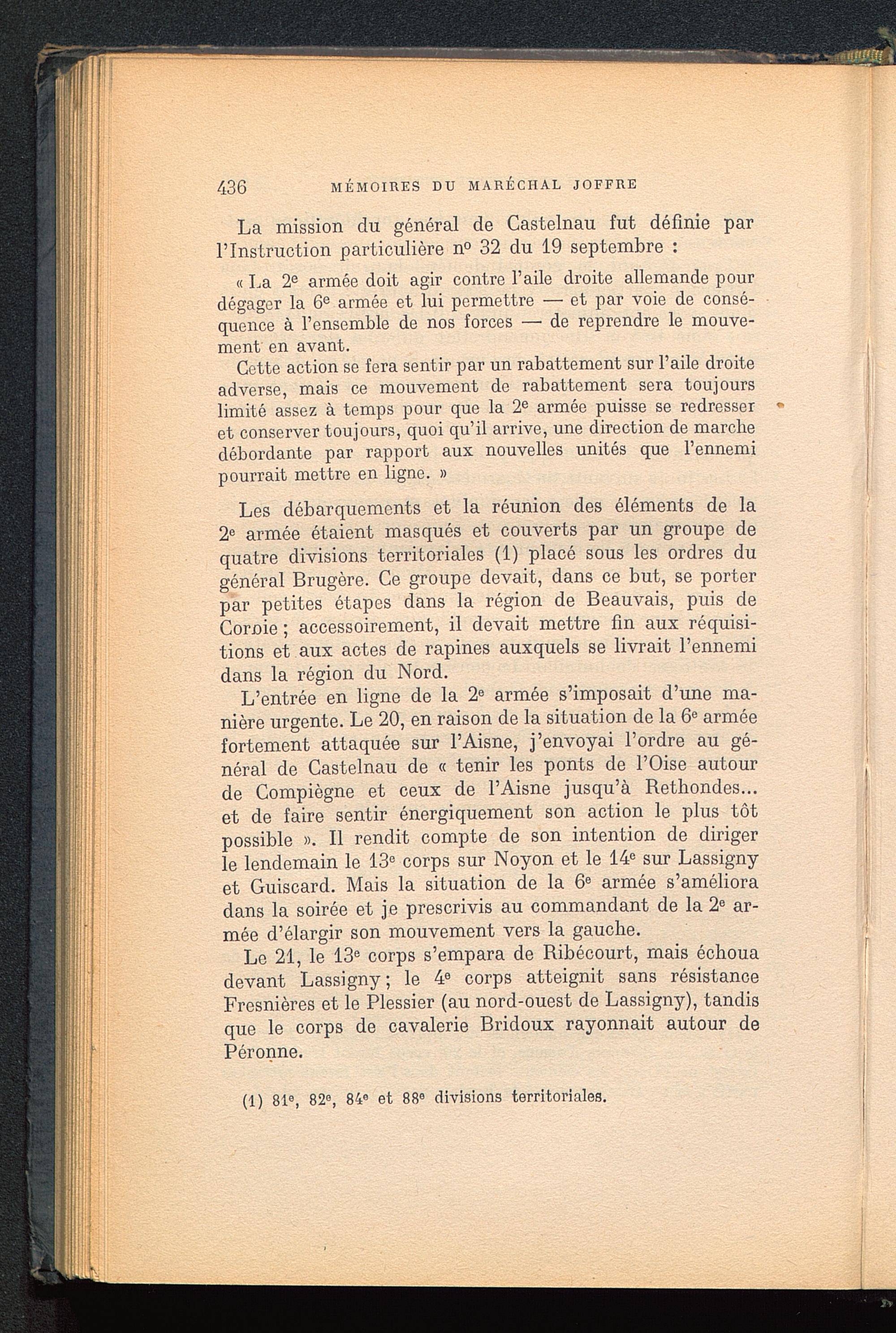 Les débarquements et la réunion des éléments de la2 e armée étaient masqués et couverts par un groupe dequatre divisions territoriales (1) placé sous les ordres dugénéral Brugère. Ce groupe devait, dans ce but, se porterpar petites étapes dans la région de Beauvais , puis deCornie ; accessoirement, il devait mettre fin aux réquisi-tions et aux actes de rapines auxquels se livrait l’ennemidans la région du Nord.