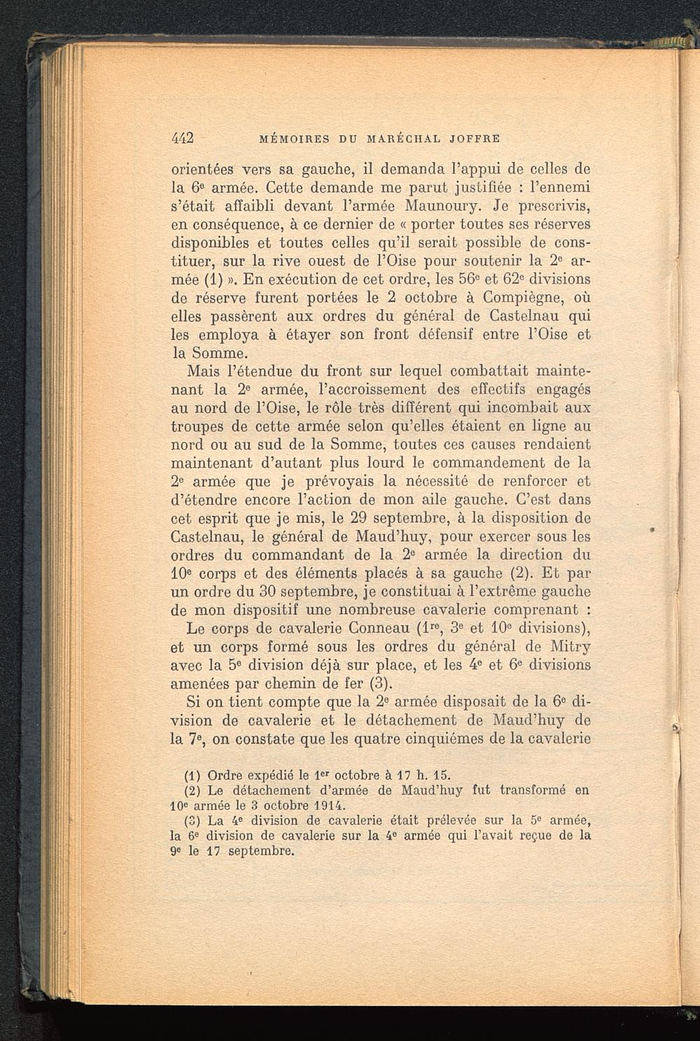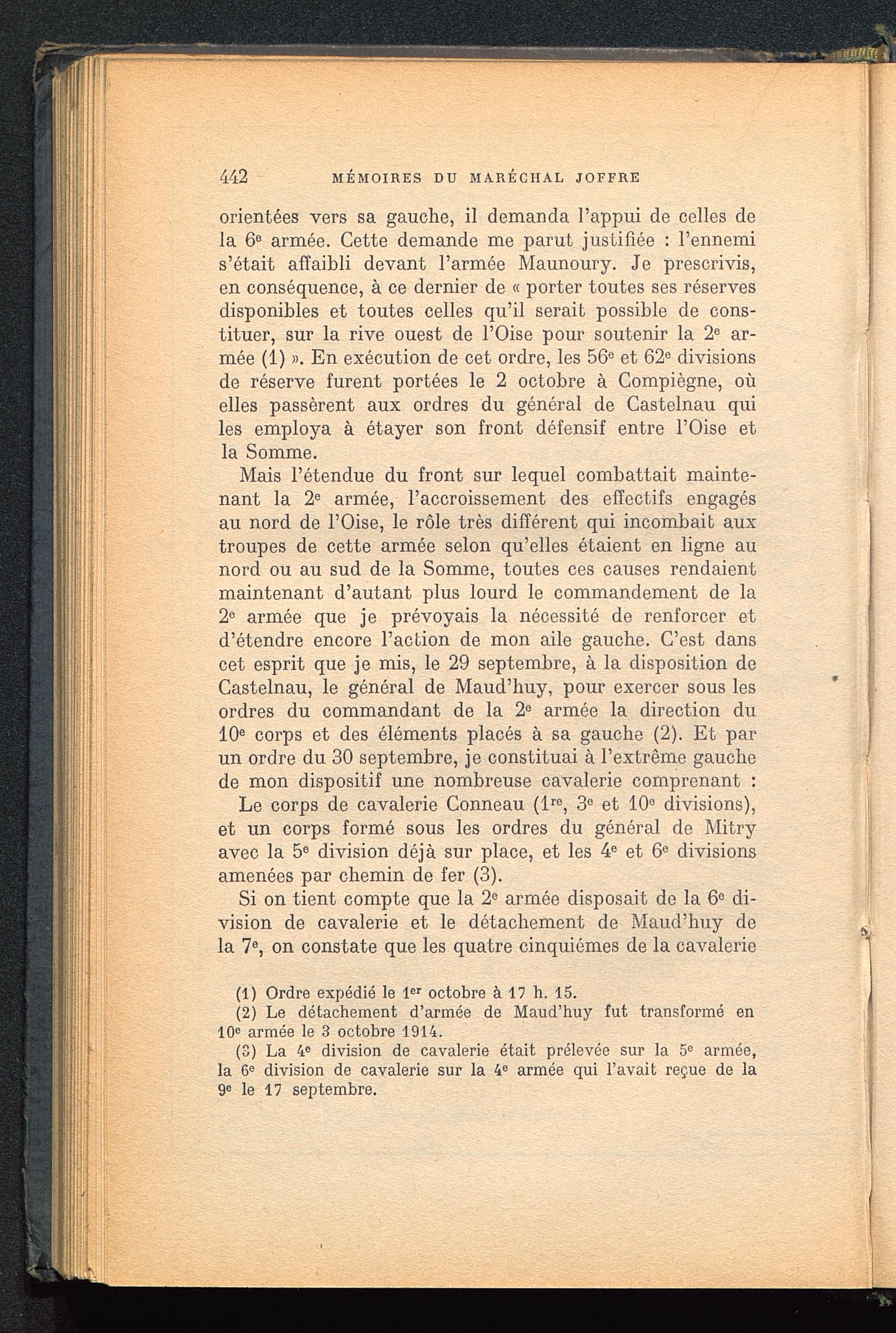 Mais l’étendue du front sur lequel combattait mainte-nant la 2 e armée, l’accroissement des effectifs engagésau nord de l’Oise , le rôle très différent qui incombait auxtroupes de cette armée selon qu’elles étaient en ligne aunord ou au sud de la Somme, toutes ces causes rendaientmaintenant d’autant plus lourd le commandement de la2 e armée que je prévoyais la nécessité de renforcer etd’étendre encore l’action de mon aile gauche. C’est danscet esprit que je mis, le 29 septembre, à la disposition deCastelnau, le général de Maud’huy, pour exercer sous lesordres du commandant de la 2° armée la direction du10 e corps et des éléments placés à sa gauche (2). Et parun ordre du 30 septembre, je constituai à l’extrême gauchede mon dispositif une nombreuse cavalerie comprenant :