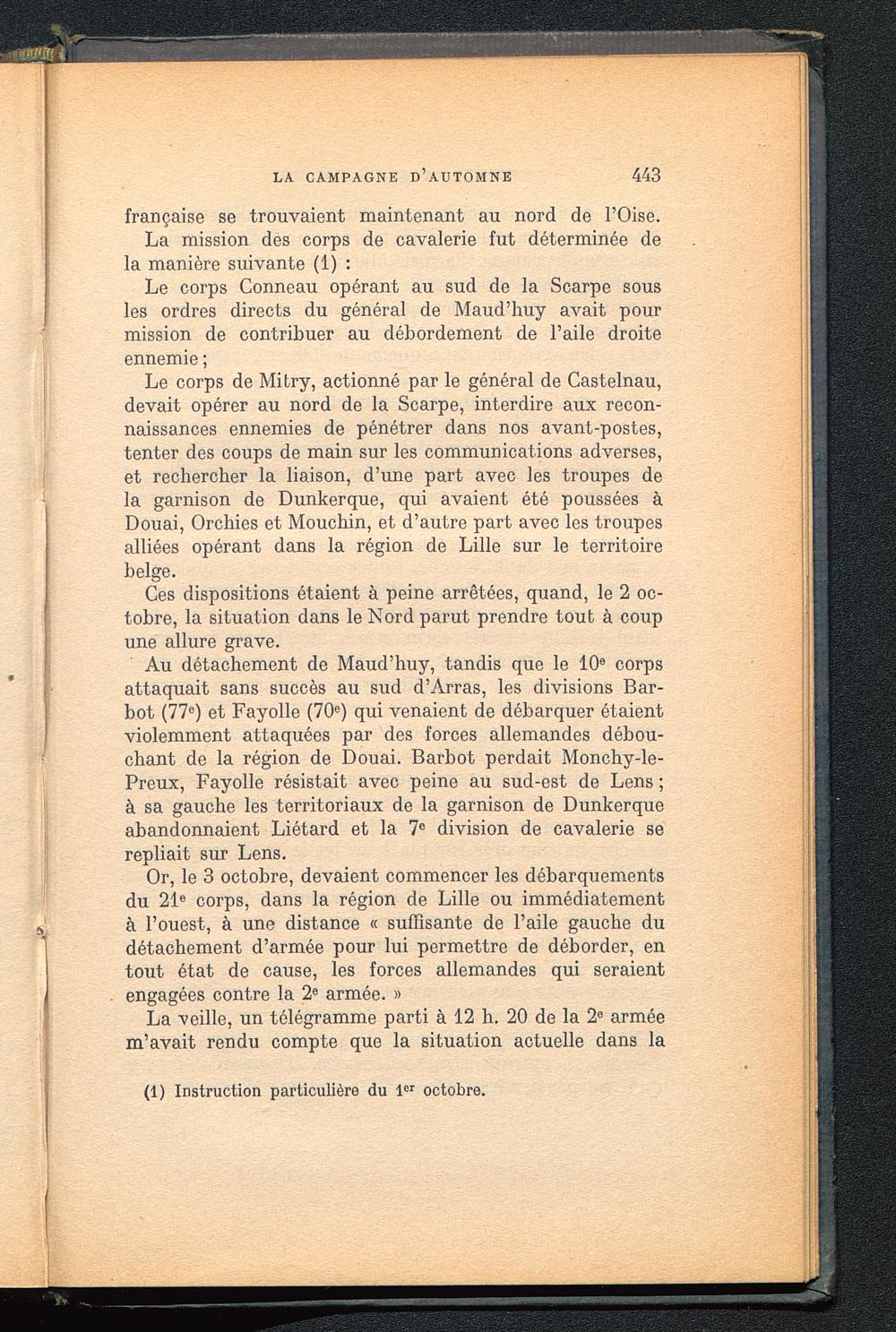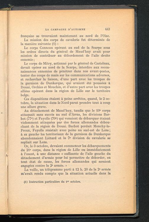 Or, le 3 octobre, devaient commencer les débarquementsdu 21 e corps, dans la région de Lille ou immédiatementà l’ouest, à une distance « suffisante de l’aile gauche dudétachement d’armée pour lui permettre de déborder, entout état de cause, les forces allemandes qui seraientengagées contre la 2 e armée. »