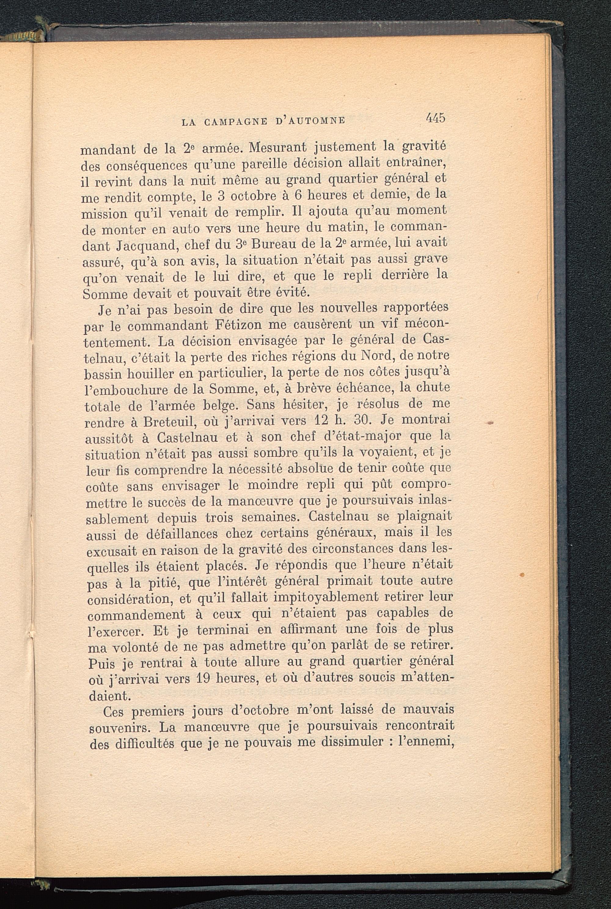 Je n’ai pas besoin de dire que les nouvelles rapportéespar le commandant Fétizon me causèrent un vif mécon-tentement. La décision envisagée par le général de Cas-telnau, c’était la perte des riches régions du Nord, de notrebassin houiller en particulier, la perte de nos côtes jusqu’àl’embouchure de la Somme, et, à brève échéance, la chutetotale de l’armée belge. Sans hésiter, je résolus de merendre à Breteuil, où j’arrivai vers 12 h. 30. Je montraiaussitôt à Castelnau et à son chef d’état-major que lasituation n’était pas aussi sombre qu’ils la voyaient, et jeleur fis comprendre la nécessité absolue de tenir coûte quecoûte sans envisager le moindre repli qui pût compro-mettre le succès de la manœuvre que je poursuivais inlas-sablement depuis trois semaines. Castelnau se plaignaitaussi de défaillances chez certains généraux, mais il lesexcusait en raison de la gravité des circonstances dans les-quelles ils étaient placés. Je répondis que l’heure n’étaitpas à la pitié, que l’intérêt général primait toute autreconsidération, et qu’il fallait impitoyablement retirer leurcommandement à ceux qui n’étaient pas capables del’exercer. Et je terminai en affirmant une fois de plusma volonté de ne pas admettre qu’on parlât de se retirer.Puis je rentrai à toute allure au grand quartier généraloù j’arrivai vers 19 heures, et où d’autres soucis m’atten-daient.