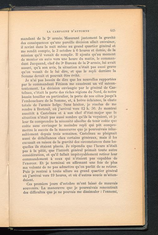 mandant de la 2 e armée. Mesurant justement la gravitédes conséquences qu’une pareille décision allait entraîner,il revint dans la nuit même au grand quartier général etme rendit compte, le 3 octobre à 6 heures et demie, de lamission qu’il venait de remplir. Il ajouta qu’au momentde monter en auto vers une heure du matin, le comman-dant Jacquand, chef du 3 e Bureau de la 2° armée, lui avaitassuré, qu’à son avis, la situation n’était pas aussi gravequ’on venait de le lui dire, et que le repli derrière laSomme devait et pouvait être évité.