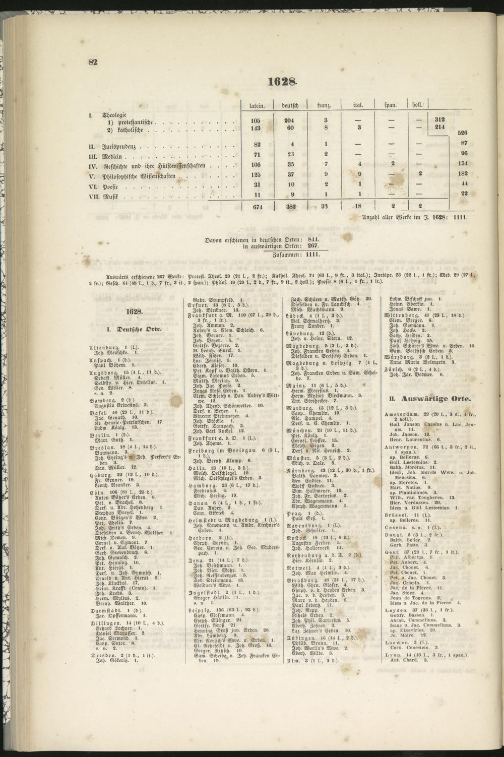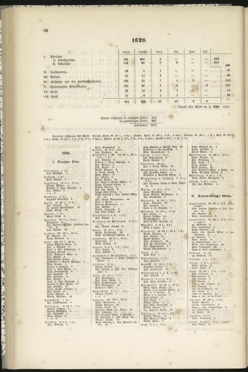Auswärts erschienene 2S7 Werke: Protest. Theol. 23 (2l l., 2 fr.); Kathol. Theol. 74 («3 l., 8 fr., 3 ital.); Jurispr. 23 (22 l,, i fr.); Med. 2» (27 l.,2 fr); Gesch. Kl (4« l., i d., 7 fr., 3 it., 2 span.); Philos. 49 (29 l., 2 d-, 7 fr., 9 it., 2 holl.); Poesie «(Kl-, l fr., i it.).