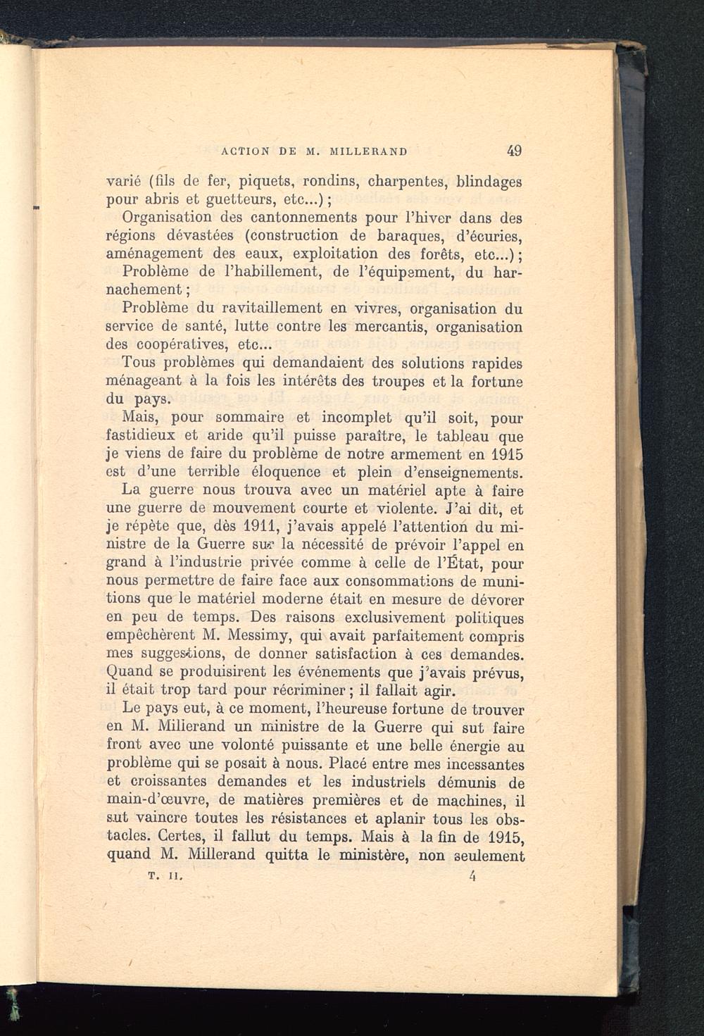 Le pays eut, à ce moment, l’heureuse fortune de trouveren M. Milierand un ministre de la Guerre qui sut fairefront avec une volonté puissante et une belle énergie auproblème qui se posait à nous. Placé entre mes incessanteset croissantes demandes et les industriels démunis demain-d’œuvre, de matières premières et de machines, ils.ut vaincre toutes les résistances et aplanir tous les obs-tacles. Certes, il fallut du temps. Mais à la fin de 1915,quand M. Milierand quitta le ministère, non seulement