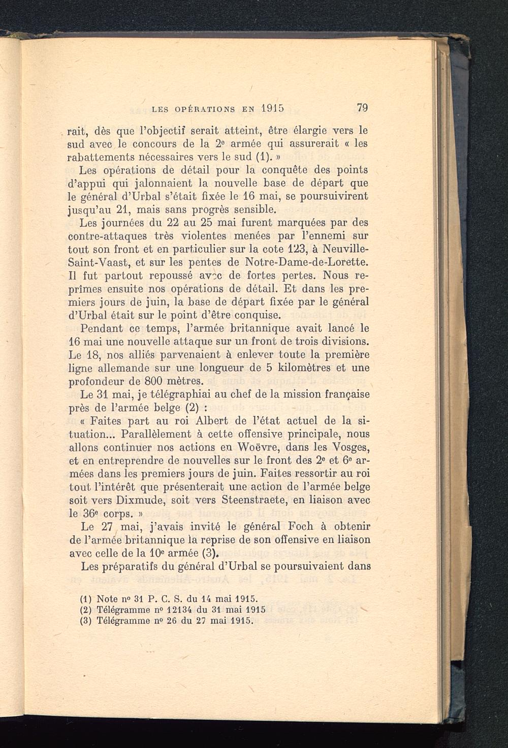 « Faites part au roi Albert de l’état actuel de la si-tuation... Parallèlement à cette offensive principale, nousallons continuer nos actions en Woëvre, dans les Vosges,et en entreprendre de nouvelles sur le front des 2 e et 6° ar-mées dans les premiers jours de juin. Faites ressortir au roitout l’intérêt que présenterait une action de l’armée belge soit vers Dixmude, soit vers Steenstraete, en liaison avecle 36° corps. »