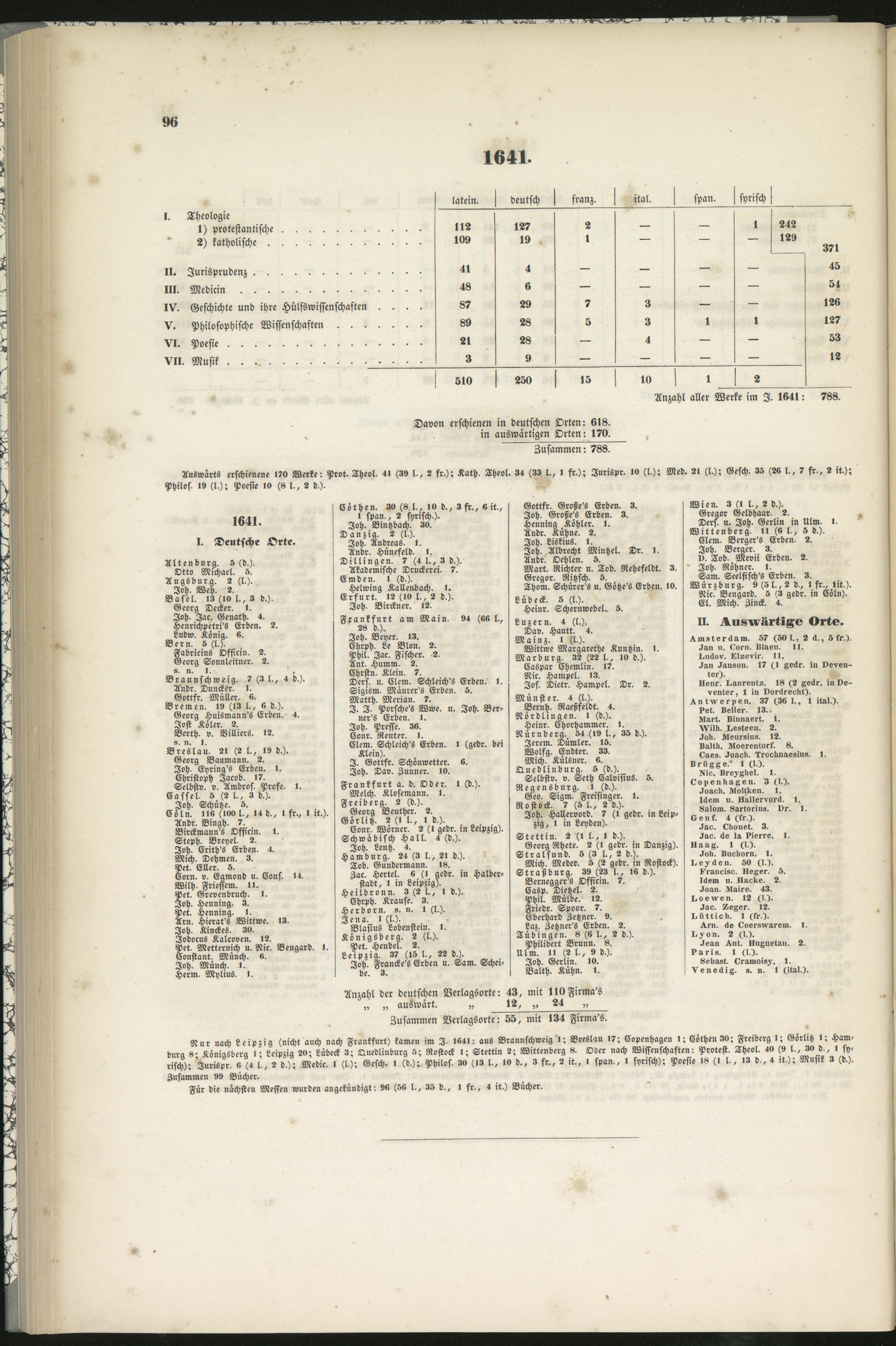 Auswärts erschienene 170 Werke: Prot. Theol. 4, (39 l-, 2 fr.); Kath, Theol. 34 (33 l., I fr.); Jurispr. 10 (l.); Med. 21 (l.); Gesch. 3S (SS l., 7 fr., S it.);Philos. 19 (l.); Poesie 10 (« l-, 2 d.).