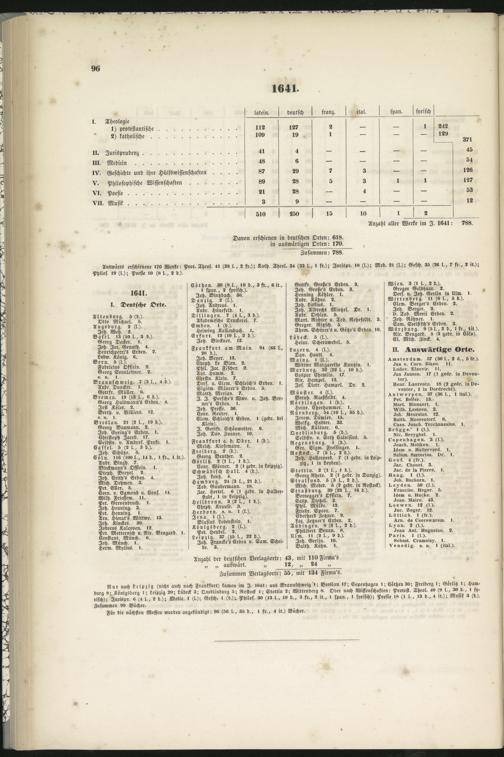 Nur nach Leipzig (nicht auch nach Frankfurt) kamen im I. IK4I: aus Braunschweig I; Breslau 17; Kopenhagen I; Cöthen 30; Freiberg I; Görlitz I; Ham-burg 8; Königsberg i; Leipzig 20; Lübeck 3; Quedlinburg S; Rostock I; Stettin 2; Wittenberg 8. Oder nach Wissenschaften: Protest. Theol. 40 (9 l., 3« d., I sy-risch); Jurispr. « (4 l., 2 d.); Medic. i (l,); Gesch. I (d.); Philos. 30 (13 l., i» d., 3 fr., 2 it., I span., i syrisch); Poesie 18 (I l., 13 d., 4 it.); Musik 3 (d.).Zusammen 99 Bücher.