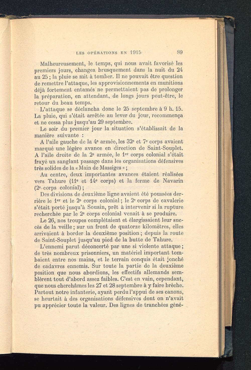 A l’aile gauche de la 4 e armée, les 32 e et 7 e corps avaientmarqué une légère avance en direction de Saint-Souplet .A l’aile droite de la 2° armée, le 1 er corps colonial s’étaitfrayé un sanglant passage dans les organisations défensivestrès solides de la « Main de Massiges » ;