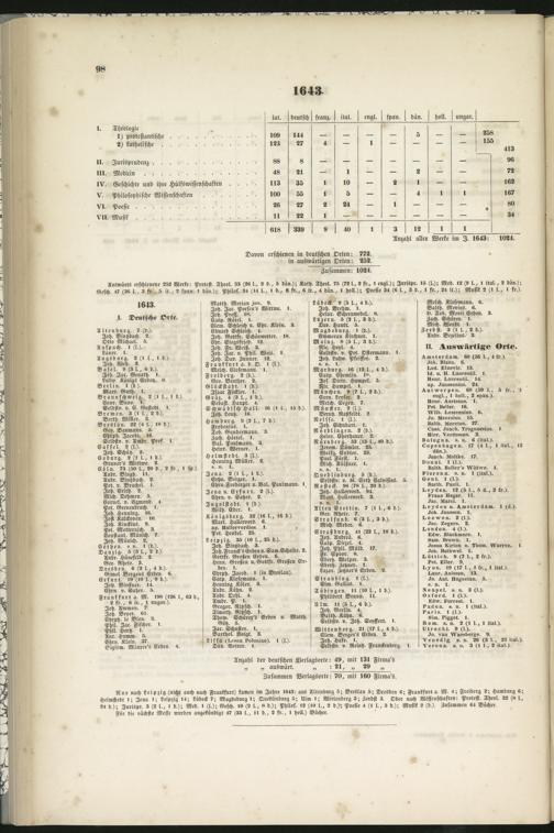 Nur nach Leipzig (nicht auch nach Frankfurt) kamen im Jahre 1643: aus Altenburg 5; Breslau 5; Dresden 6; Frankfurt a- M- 4; Freiberg 2; Hamburg 6;Helmstedt i; Jena l; Leipzig 14; Lübeck 7; Magdeburg i; Quedlinburg 5; Ulm i; Wittenberg 3; Zerbst 3. Oder nach Wissenschaften: Protest. Theol. 32 (8 l-,24 d.); Jurispr. 3 (2 l., i d-); Med. i (l.); Gesch. i« (2 l., 8 d.); Philos. 12 (10 l., 2 d.); Poesie 4 (I l., 3 d.); Musik 2 (d.). Zusammen 64 Bücher-