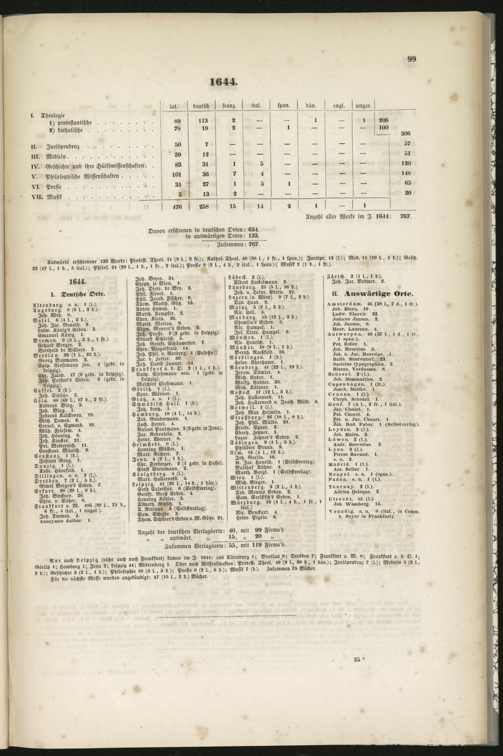 Nur nach Leipzig (nicht auch nach Frankfurt) kamen im I. 1644: aus Altenburg i; Breslau 9; Dresden 7; Frankfurt a. M. 8; Frankfurt a. d. O. i-Görlitz i; Hamburg i; Jena 2; Leipzig 44; Wittenberg 4. Oder nach Wissenschaften: Protest. Theol. 40 (9 l., 30 d., t dän.); Jurisprudenz 2 (l.); Medicin 5 (3 l,^2 d,); Geschichte 3 (2 l., i d,); Philosophie io (5 l-, 5 d); Poesie 8 (2 l., 6 d,); Musik 7 (d,). Zusammen 75 Bücher,